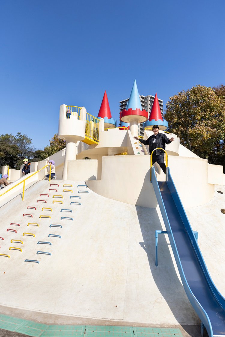 そうそう、やっぱ飛鳥山公園ですごいのはこのコンクリートゾーンでしょ。お城を中心にさ、この入ったら出られなくなりそうな昭和の遊具たちすごいよね。大人も子供も、何かしら解放されるものがある。お城の滑り台もやっとこうか。一番上から滑ってみるわ。おおおお! やっぱコーティングされてるから、滑りがいいわ(笑)。前来たときにも言ったけど、この公園のクラシカルな遊具で骨折した人たちって軽く1000人超えてると思うんだよ(笑)。もう世界に誇れると思うけどね、ここの遊具は。本当に最近だともう見られないでしょ、このデザインと規模感は。