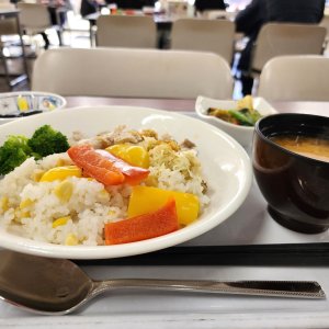 店内は丸や四角のテーブルが並び、ポップな色調で明るく、食堂というよりはカフェテリアみたい。席数は70席ほどで、こぢんまりとしている。