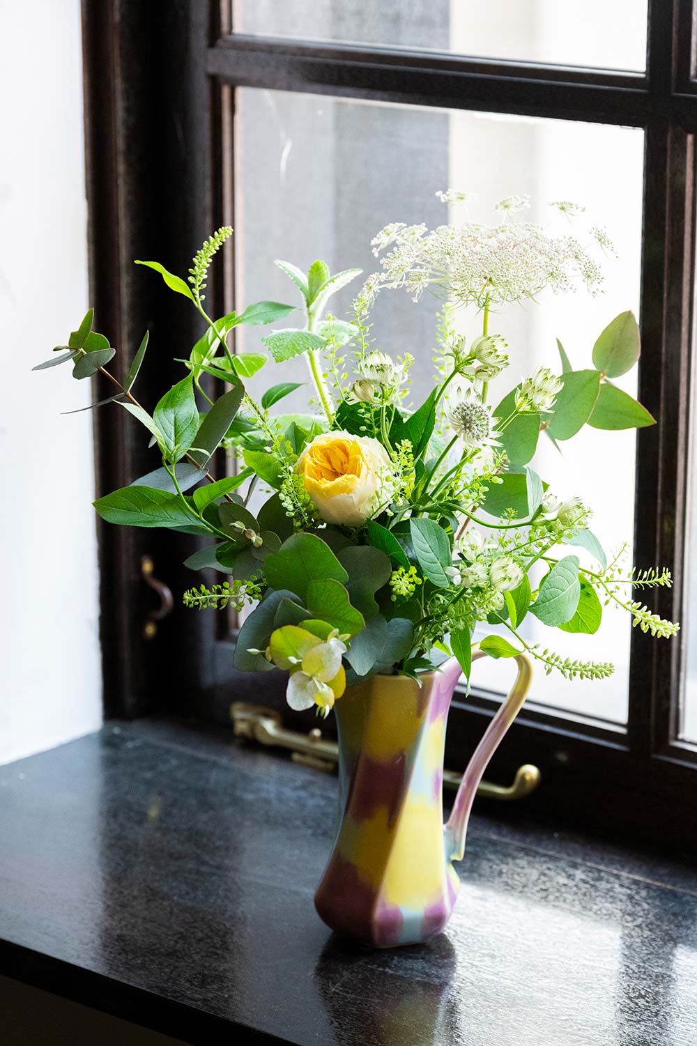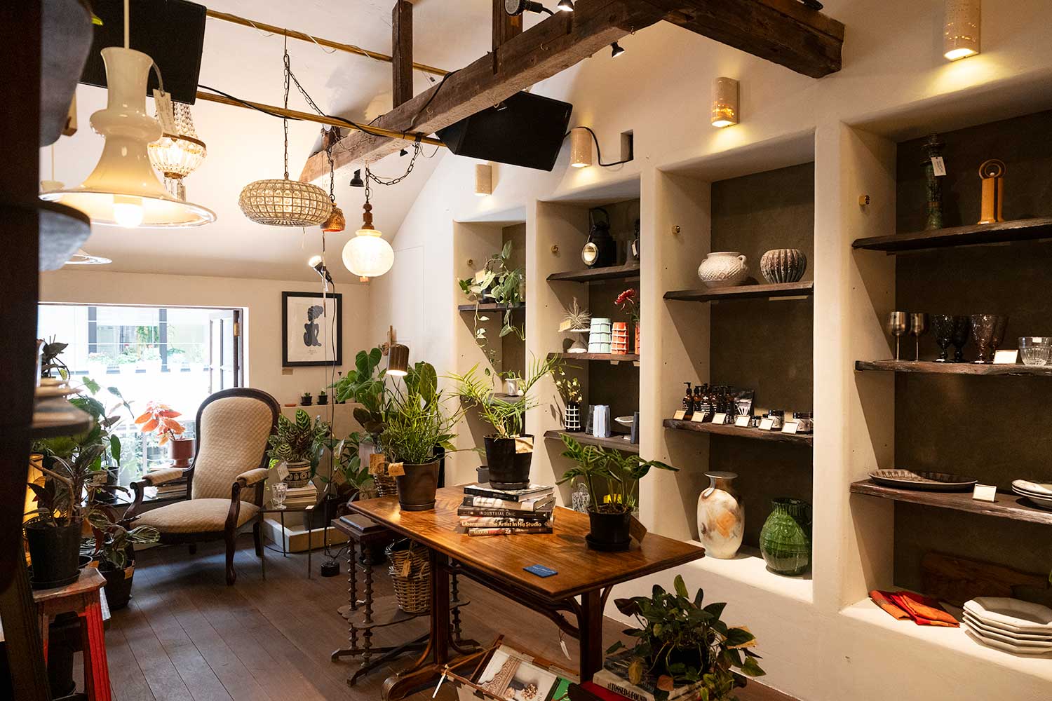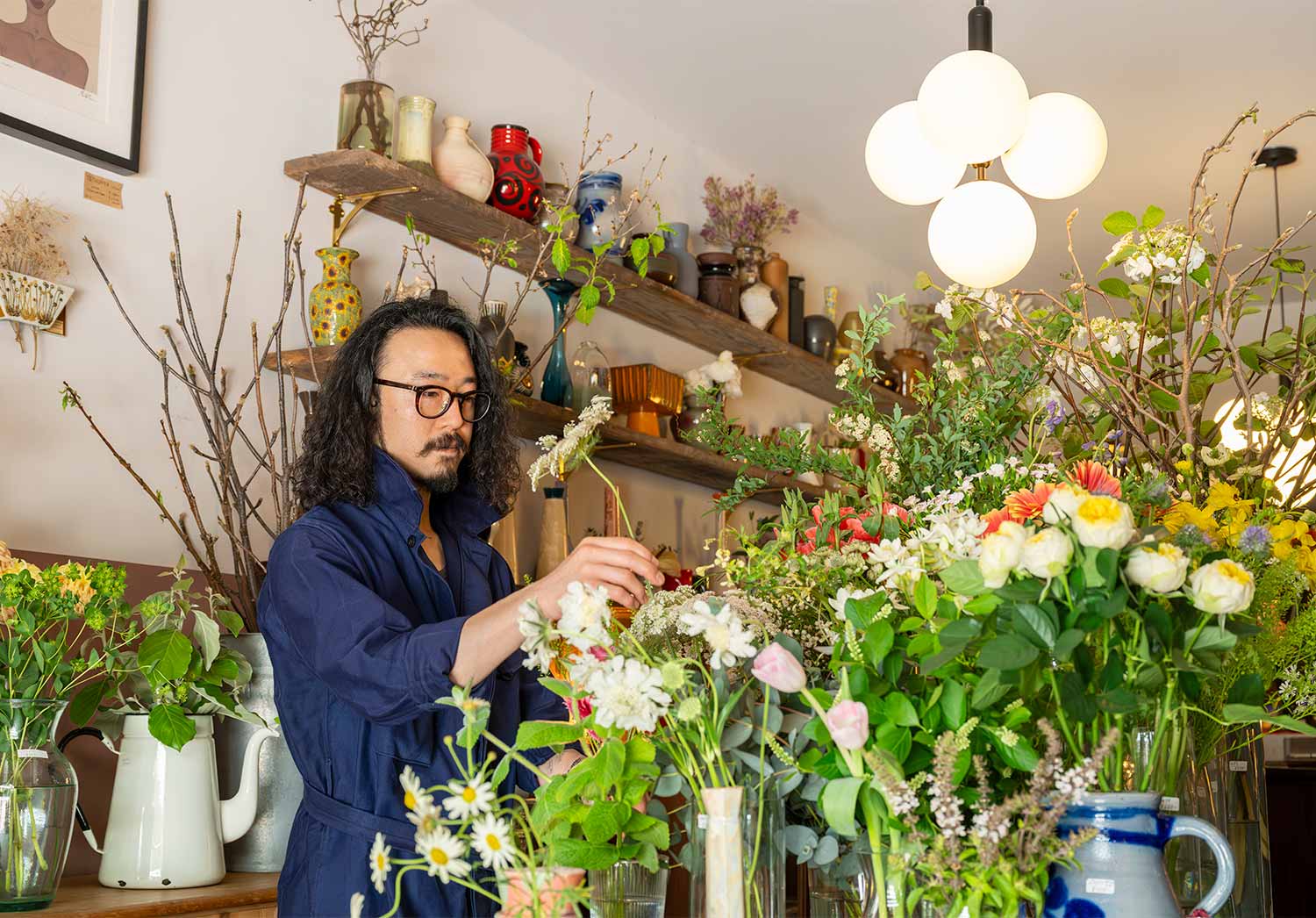以前から花屋兼インテリアショップを営み、照明を柱に空間デザインを手掛けてきたディレクターの福嶋慶太さん。部屋を明るく見せてくれる花や、良いシルエットの枝ものも揃い、2023年、日本橋馬喰町に移転して以来「近所の方々が花屋として普段遣いしてくれます」。Ceramichiの花器など、作家ものセラミックアートも充実。