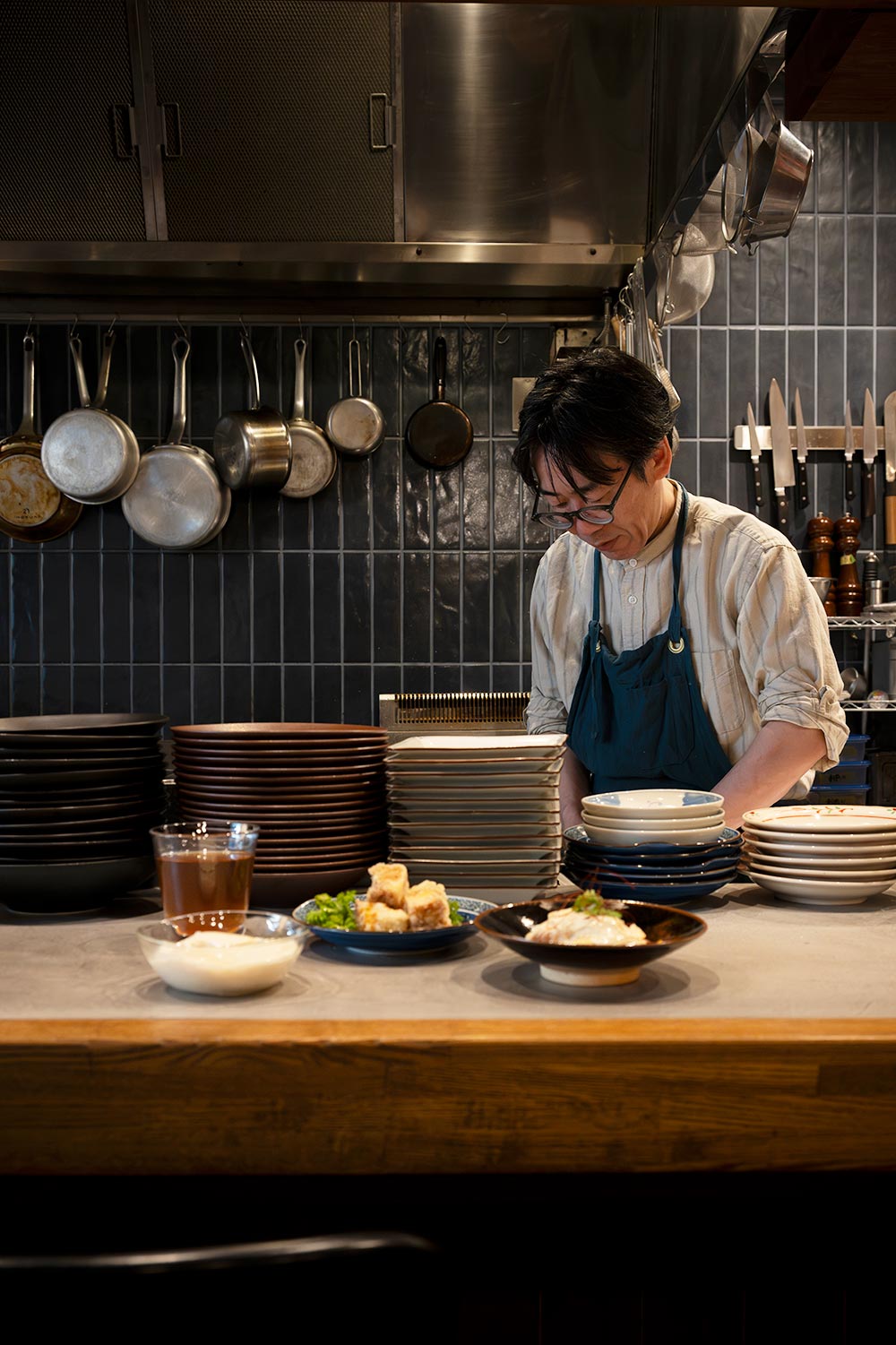 現在、全国的にも豆腐屋は減る一方。豆腐マイスターの資格を持つ工藤詩織さんが言うには「昔は5万軒くらいありましたが、今はその10分の1以下」。それを思うと、人形町の甘酒横丁に『四方八方』がオープンしたというニュースは、まさに吉報。しかも、早い時間帯に売り切れ終了となってしまう豆腐屋が多い中「うちは夜まで営業していますし、小売りもしているので、仕事帰りの方にも立ち寄ってもらえます」。通りに面した工房に立つのは、和歌山県の龍神村で地釜炊きの豆腐を作っていた小澤聖さん。奥では、できたての豆腐を使って料理人が腕を振るう。