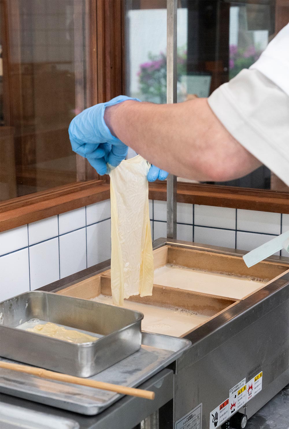 あらゆる調理法を駆使し、バラエティーに富んだ豆腐料理を提供。主役として、またある時はメイン食材を支える黒子として豆腐が活躍する。よだれ鶏の上に重ねた汲み上げ湯葉は、ラー油と黒酢を合わせたタレを絡めると甘さが際立ち、クリーミー! 工房ものぞけるので、豆腐をきっともっと好きになる。