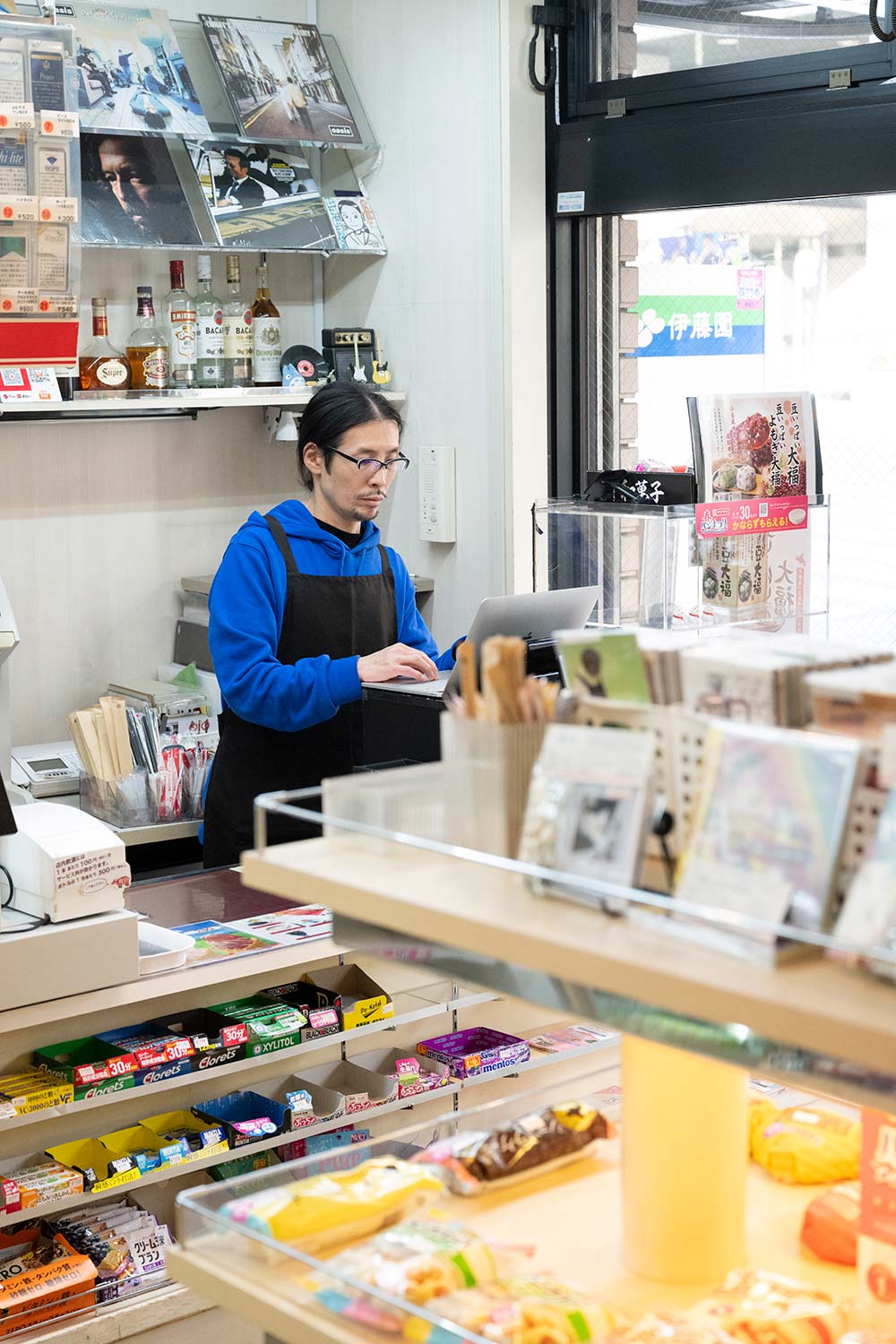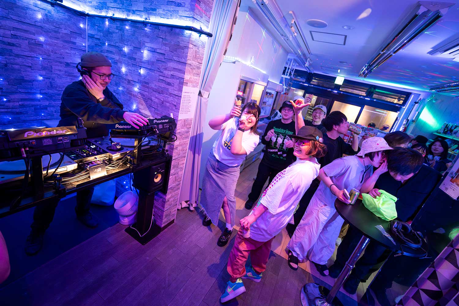 週末、いつもと違う照明の下でイベントが大盛況。およそ100年前、初代がこの場所で酒屋を創業し1999年、コンビニに業態変更した。「営業中にBGMとしてレコードをかけていたらレコード好きが集まるようになって、そのうち販売も」と、3代目の進藤康隆さん。元々倉庫にしていた地下を整理し、プロによるDJ教室も開催している。