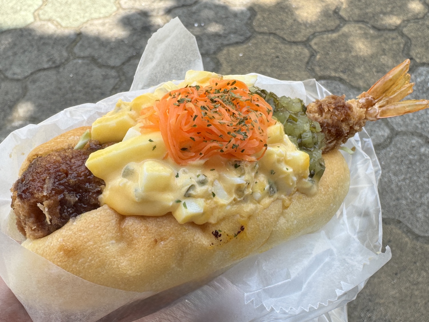 『ごちそうパン ベーカリー花火』の総菜パンは、なかなか手が込んでいる。たとえばジャンボエビフライドッグ。ふんわりしたパンに挟まれたエビフライが、まず巨大。そのエビフライにはソースがかけられたうえ、たっぷりのタルタルソース。そこにニンジンラペがのり、さらにピクルスまで添えられている。