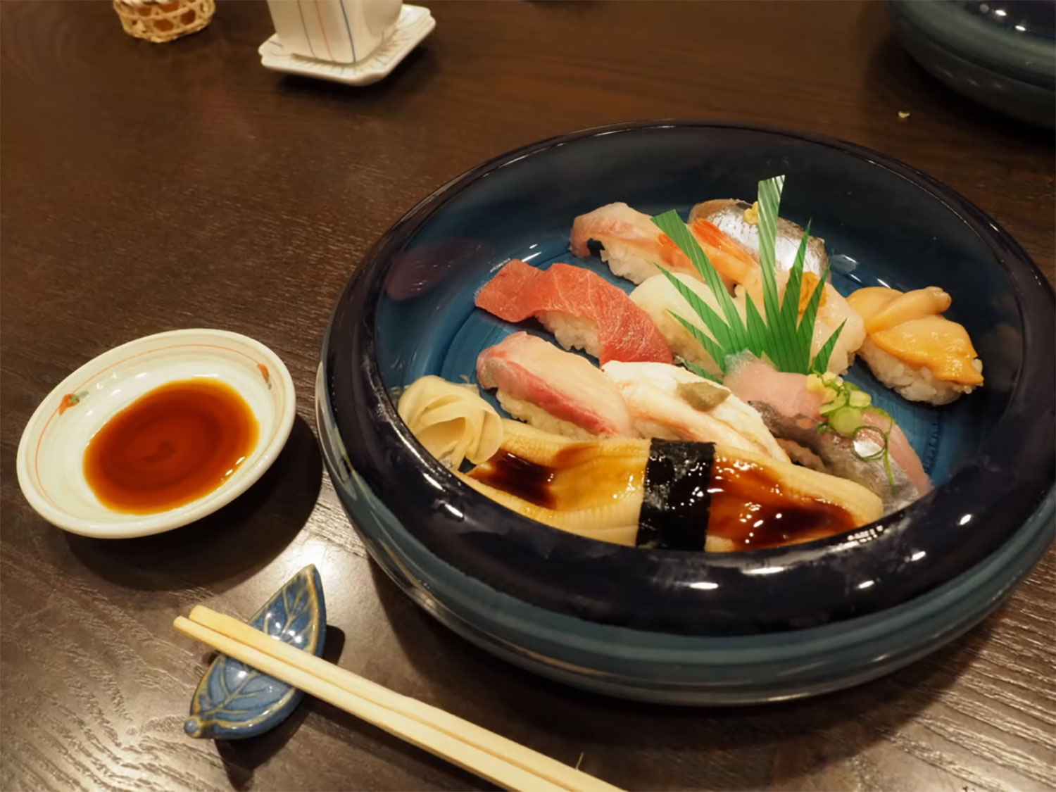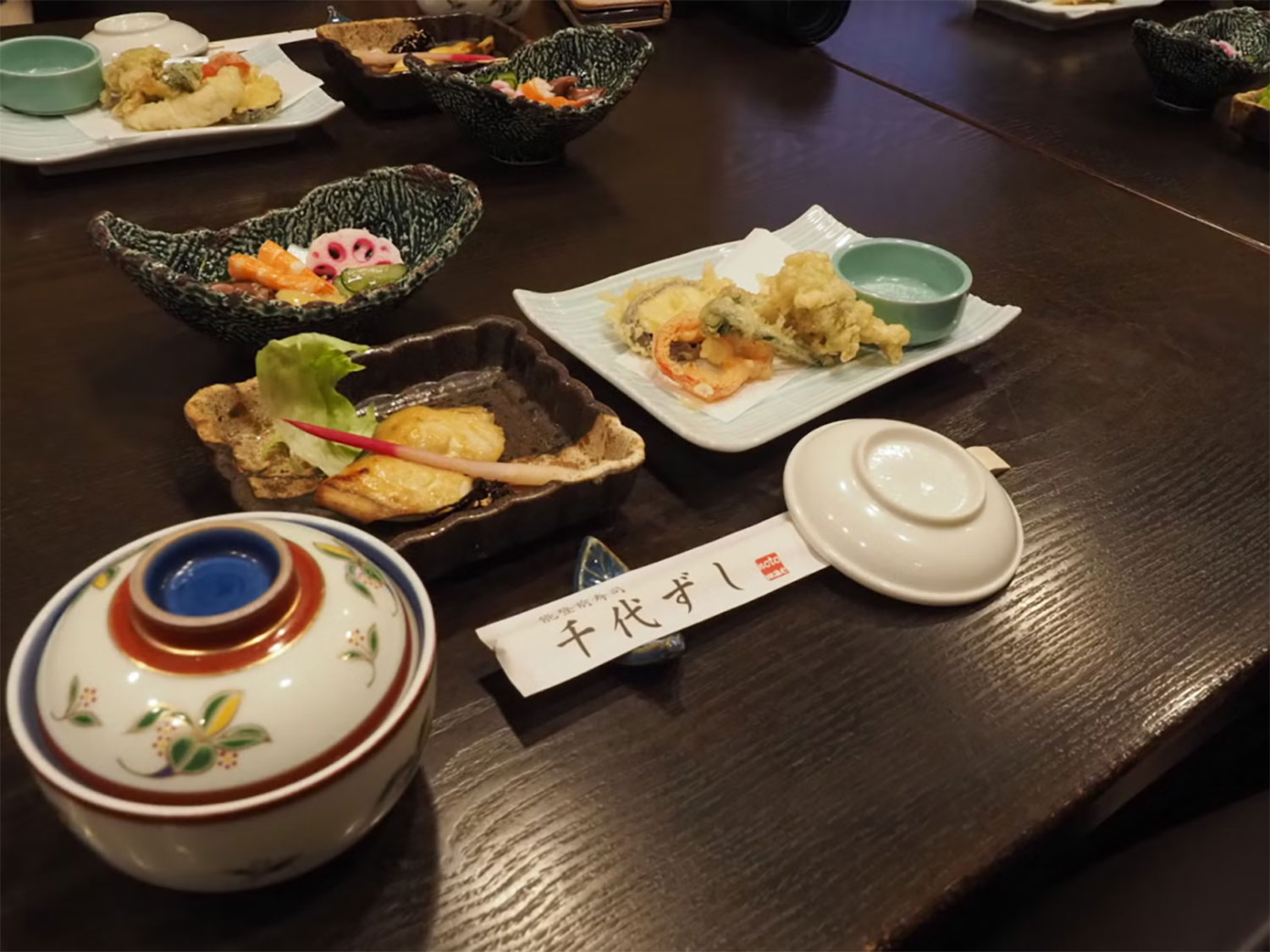 夜ごはんは『高澤ろうそく店』の方におすすめしていただいた、近くにある「能登前寿司」のお寿司屋さんへ。予算を伝えて予約をしておいたら、到着時にはすでにお寿司以外の料理が用意されていました! ホスピタリティがすごい!