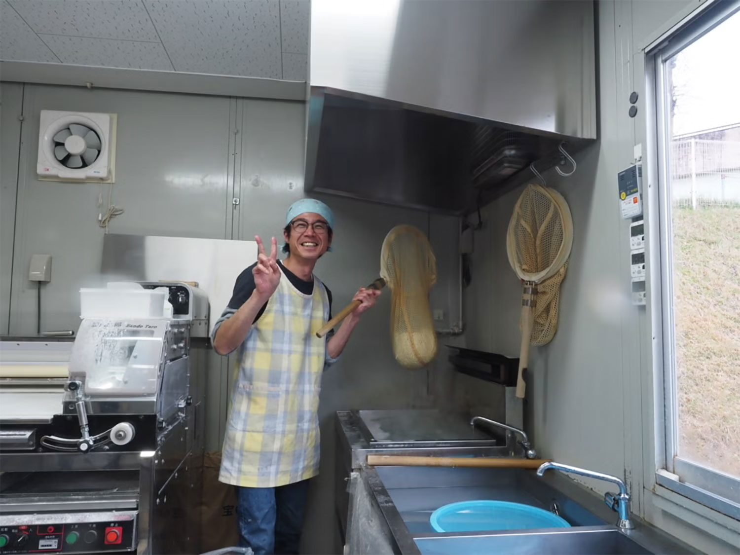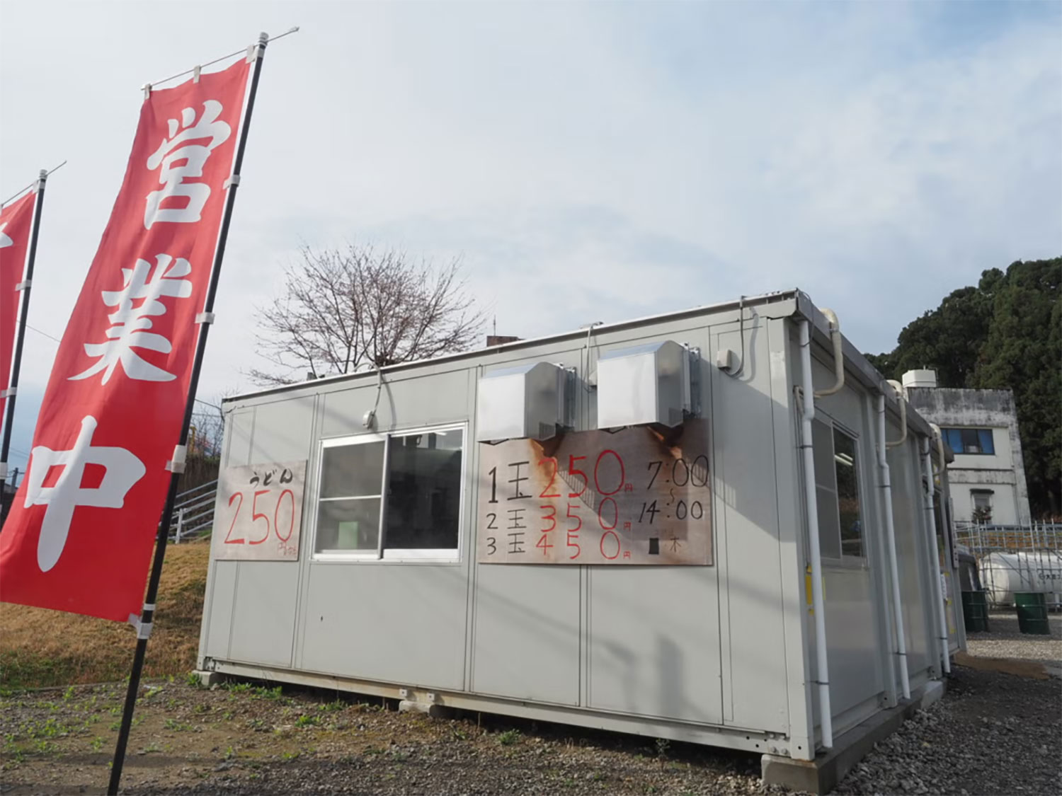 こちらが徒歩15分ぐらいのところにある『うどん山口 七尾』さん。震災後にできた店舗で「営業中」の、のぼりのインパクトがすごいのですぐ気づきます。オープンは朝の7時からなのですが、7時半の時点でほぼ満席でした。大人気!!