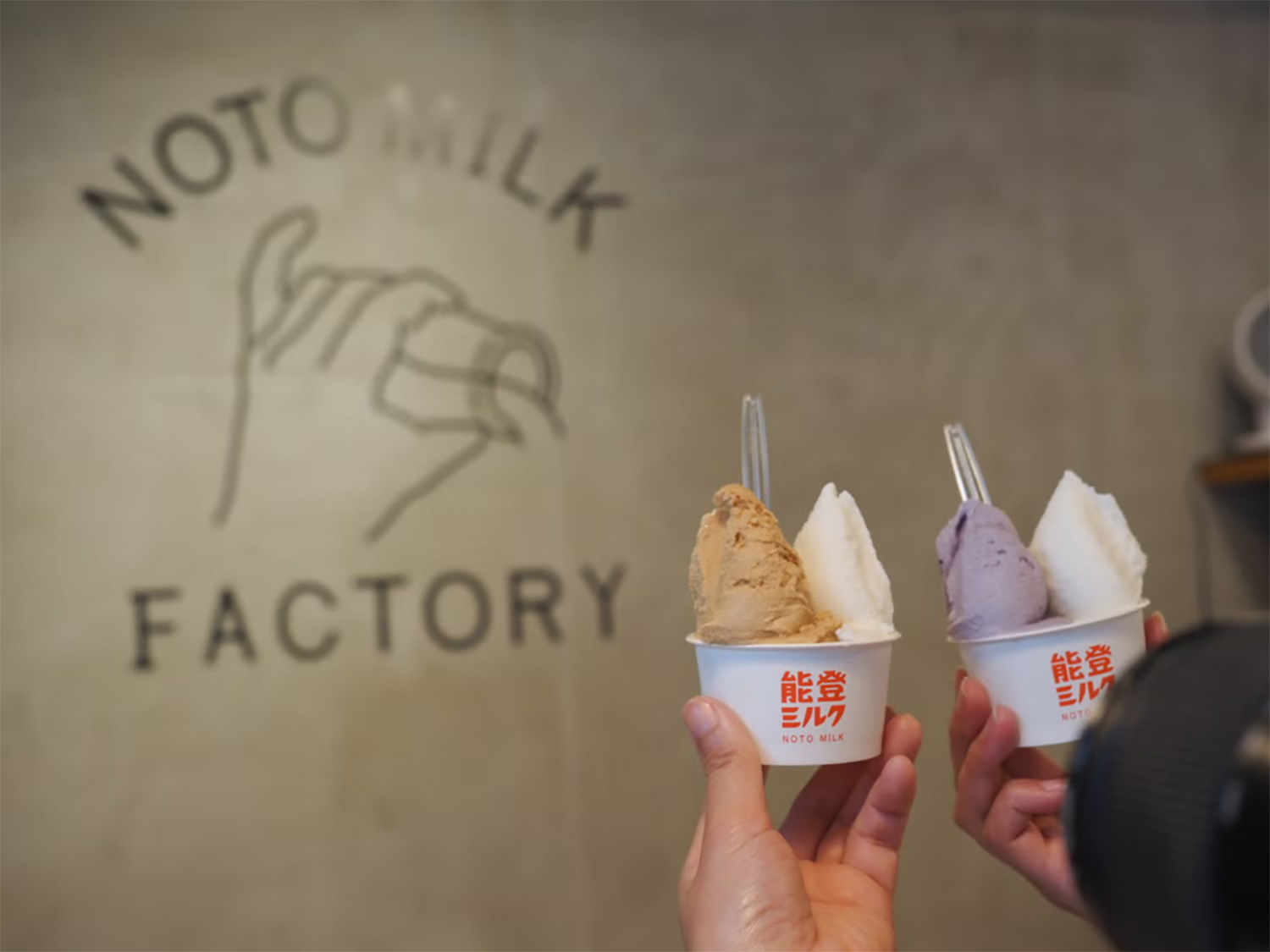 七尾市街地から車で20分ほど、電車だと1駅のところにある和倉温泉街。ここに、能登で生産された牛乳だけを使ったミルクスタンドがあるのです! 店舗がかわいすぎて早く撮りたいし、ジェラートの種類も豊富すぎて選べないし……みんなでワイワイ楽しんでしまいました。