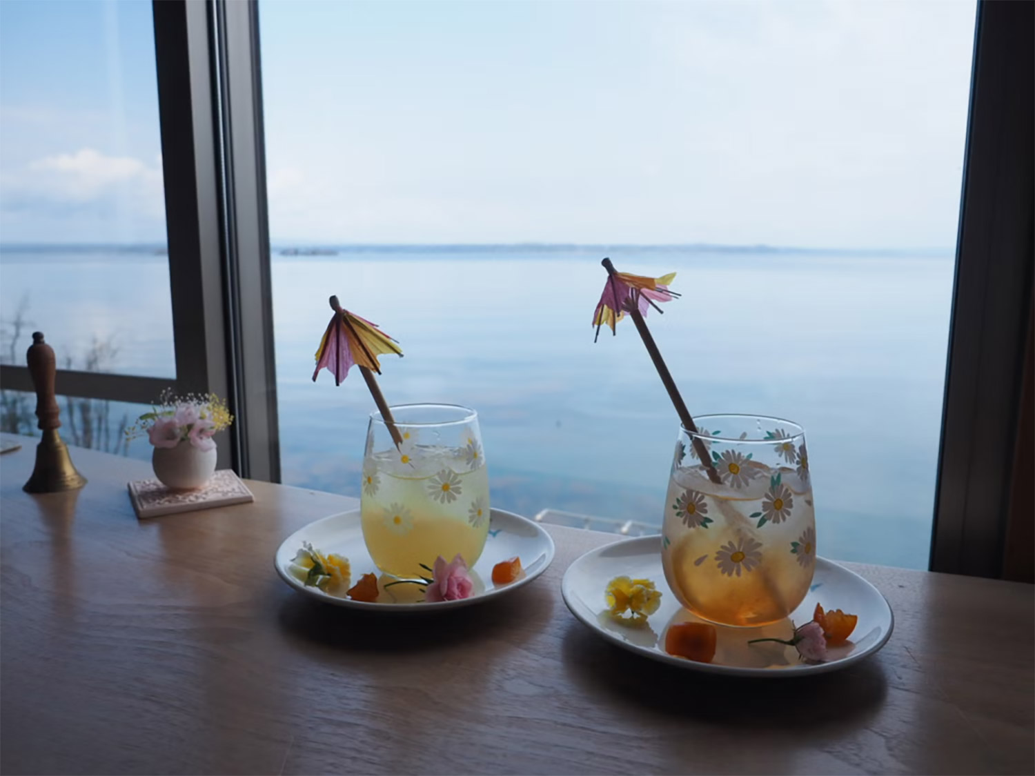 イルカのアクティビティを実施している事業者さんはいくつかあるのですが、今回利用した『I LOVE DOLPHIN』はカフェ『海とオルゴール』も運営されていたので帰りに寄ることにしました。海沿いにあって眺めも抜群。そして店内がかわいい! おしゃれなトロピカルジュースを頼み、当然のように撮影会が始まりました。