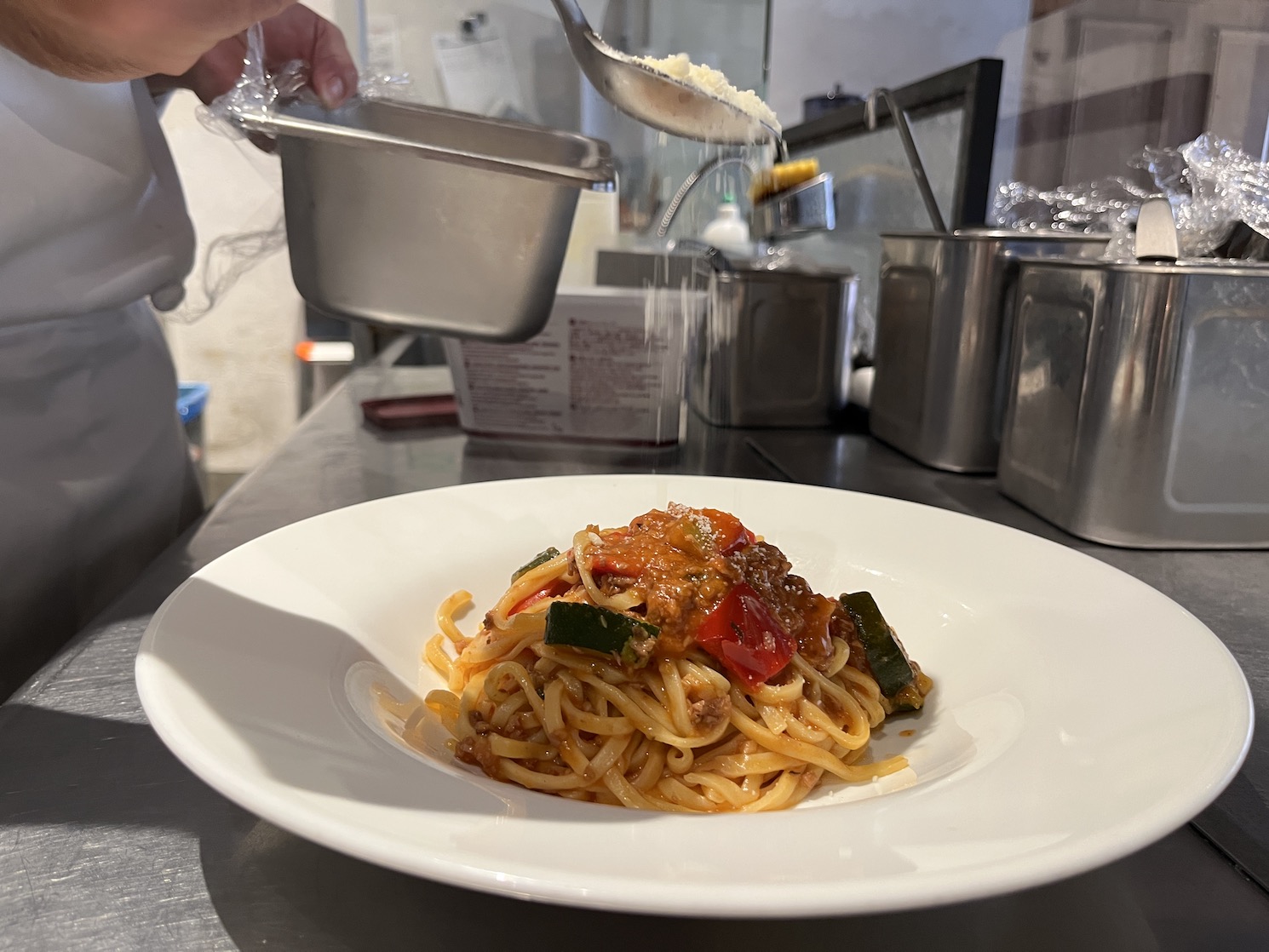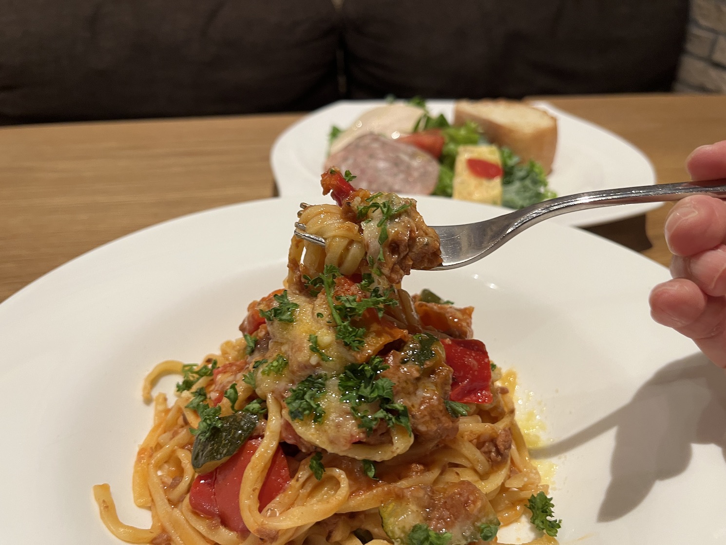 一方、トマトの旨味が存分に引き出されたソースに平たくて細いパスタ、タリオリーニがよく合う。もっちもちした弾力と生麺ならではの小麦の甘みがあって、これはクセになりそう! パプリカとズッキーニのソテーが甘みと香りを演出し、スタンダードなミートソースの味に層を重ねている。むむむ、まろやかでやさしい味わいなのに香りや食感にはメリハリがあって、これはなかなか味わい深いですな。