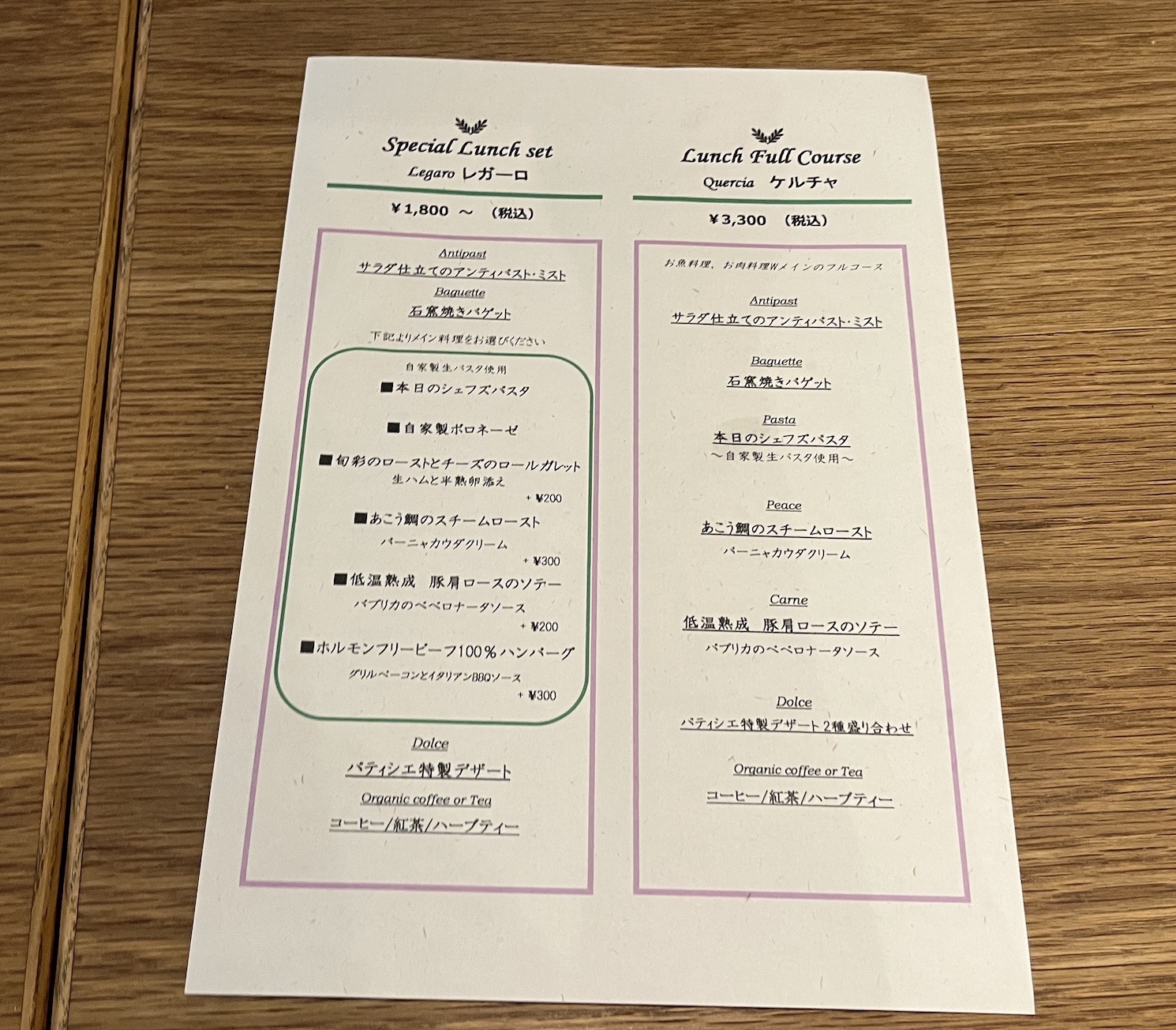 入り口の看板で見た自家製ミートソースボロネーゼが食べたいなぁ。おなかが減っていたから、前菜などもつくスペシャルランチセットレガーロ1800円をオーダーしよう。