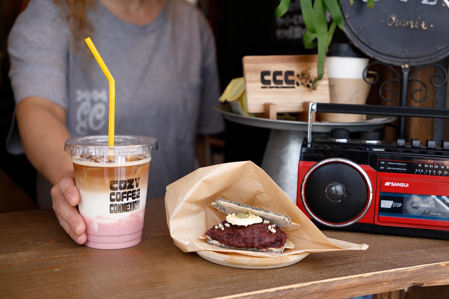 生豆を自然乾燥させたエイジングビーンズ使用のコーヒーが気軽に楽しめるコーヒースタンド。オーナー沢口浩二さんの出身地である青森の名物、南部せんべいにあんこを挟んだどらべい230円との相性もバッチリ。カフェストロベリーミルク770円はアポロチョコのような味わいでハマる人続出。