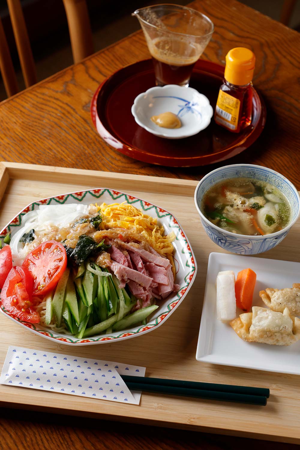 以前ギャラリーをともに運営していた女性4人が移転を機に飲食の世界へ。日替わりランチ1000円〜は各自の得意料理を提供。この日は佐野晴美さんのゴマだれ冷やし中華と揚げ餃子のセット。「山ガールの佐野さんはパパッと調理する名人」と話すのはカレー担当の田口淳子さん。どのメニューも野菜たっぷりでやさしい味わい。