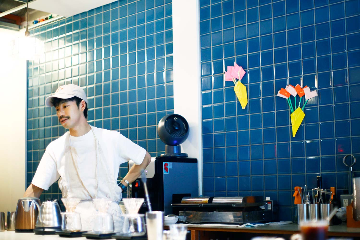 シアトルでバリスタと焙煎(ばいせん)士の経験を積んだ沢田真洋さんが、愛する地元に2022年に開いたカフェ。コーヒーは、湘南に縁のある焙煎所から選んだ5種ほどをハンドドリップやエスプレッソで味わえる。そのお供に焼き菓子やワッフルを。「老若男女が集まれる場を作りたかった。赤ちゃん、ワンちゃん、90代の方まで訪れますよ」。海を思わせる青いタイル壁には常連キッズがくれた折り紙の花束が。朝からほのぼの、幸せ気分。