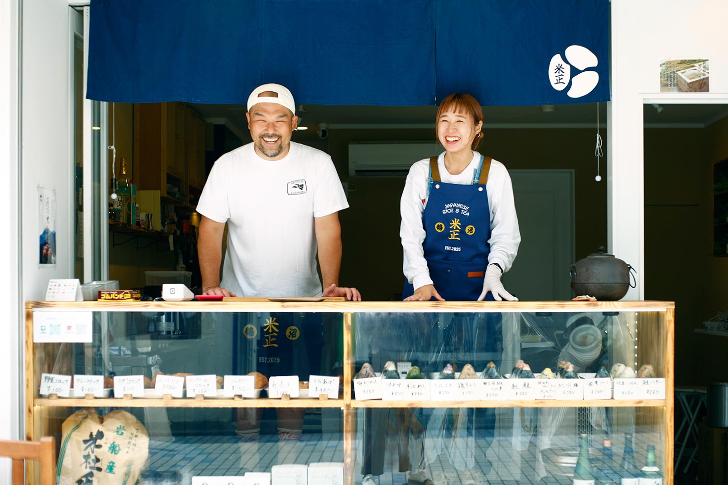 「新潟のおいしいお米を食べてもらいたい」と小林正吾さんが2025年1月に開店したおにぎり販売店。明るいスタッフ陣が立つカウンターのショーケースには、熊本県天草の青海苔を使ったそばめし、しばマヨなどの個性派も含め約15種類並ぶ。からあげやコロッケなどの揚げ物も人気だ。