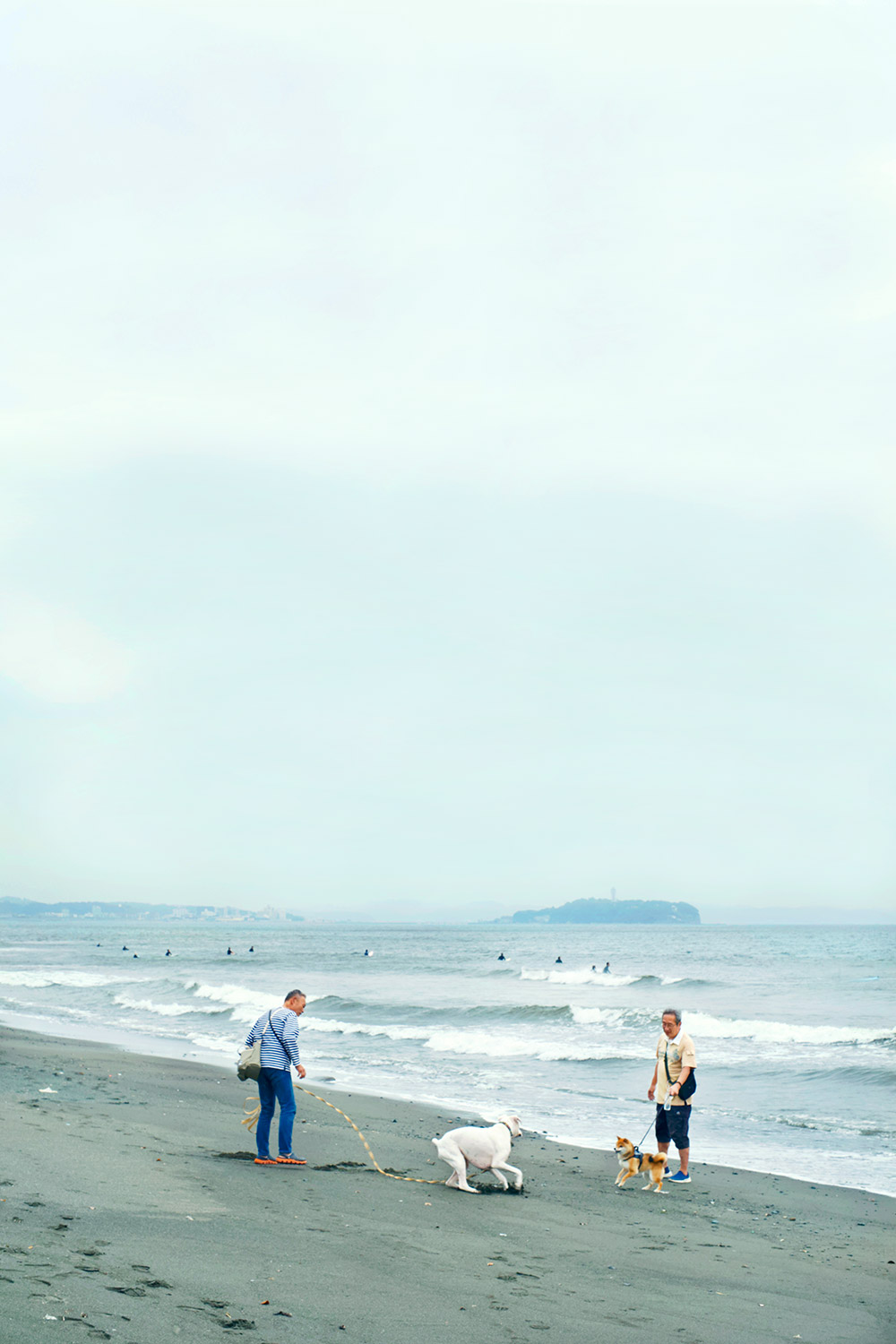 鵠沼海岸から続くのは辻堂海岸。歩きやすいサイクリングロードもあるけれど、波に近づきビーチコーミングしながら歩くのも楽しい。犬の散歩も多く、時にはこんなほほえましい光景も(上写真)。砂浜は犬も人もはしゃがせる。
