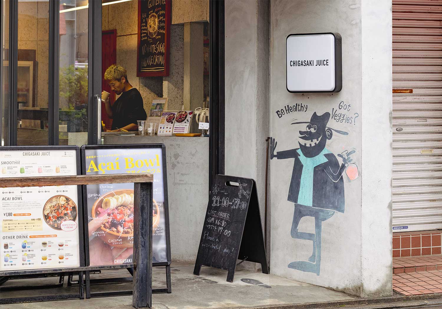 リュウ 海外でいろんな壁画を見てから、茅ケ崎にも壁画を残したい、自分の絵をたくさんの人に見てもらいたいと思うようになって。7年ほど前、バイトをしながら創作活動をしていた頃、「Bowl Market Juice & Deli」(現在の『CHIGASAKI JUICE』)に通い、絵を描いていたんです。店の方が僕の絵に興味を持ってくれ、これはチャンスかもと、「壁に描いてもよいですか」「いいよ、面白そう」と。