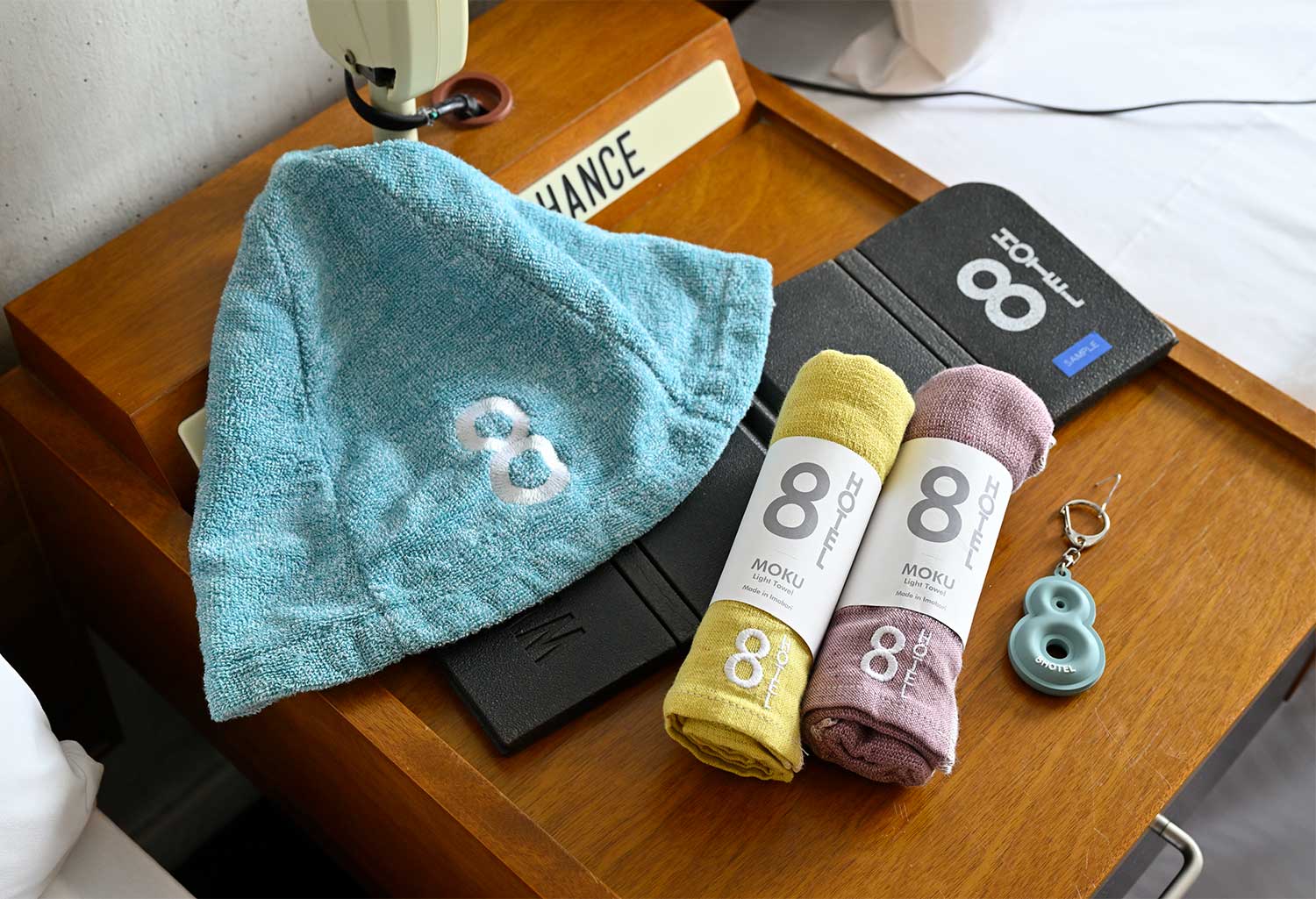 テーマは「1週間に8日目があったなら」。私なら青の洞窟のごときスパで癒やされた後、自室でオリジナルクラフトビール880円をクイッ。1階の8ラウンジで開催されるマルシェでにぎわいに包まれたいですね~。おっと、ロビーにはサウナマット1000円やタオル1300円などの8グッズが。「全種買ってくださる方もいて」と支配人の松井さん。思わず手が伸びる可愛いデザイン。計画的犯行ですね~。