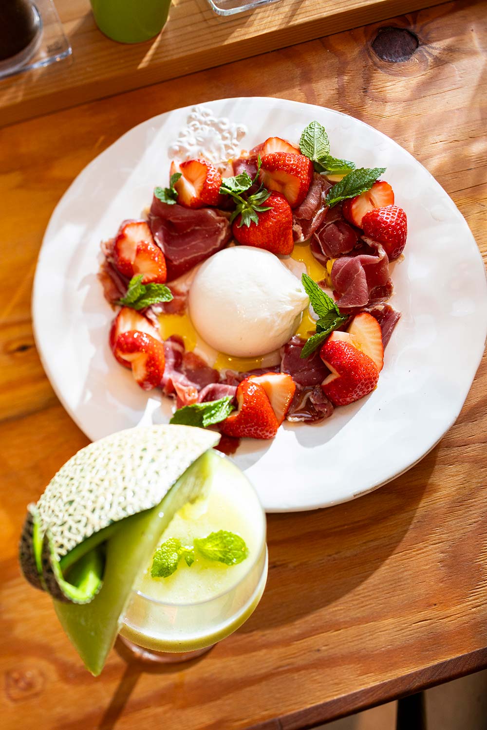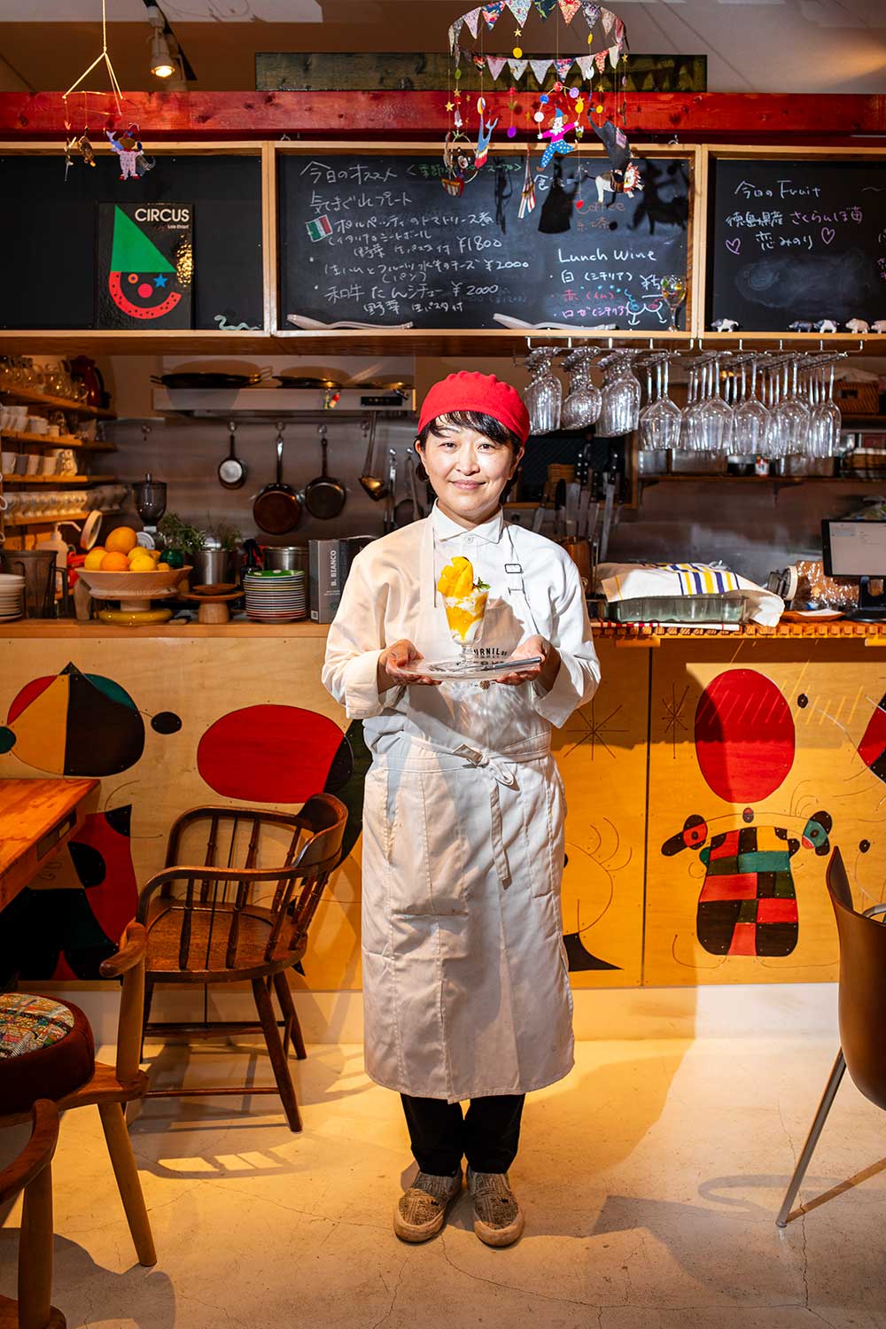 オリーブの木陰に設置した「きんじょの本棚」が目印。がっつりランチ、シャルキュトリーでワインを一杯など、どんなシーンにも寄り添い楽しませてくれる。イチゴと生ハム、モッツアレラチーズを使用の前菜2000円や、マンゴーパフェ1800円、スムージー700円など果物メニューが多いのは、店主・滝田礼子さんの実家が果物専門店だから。
