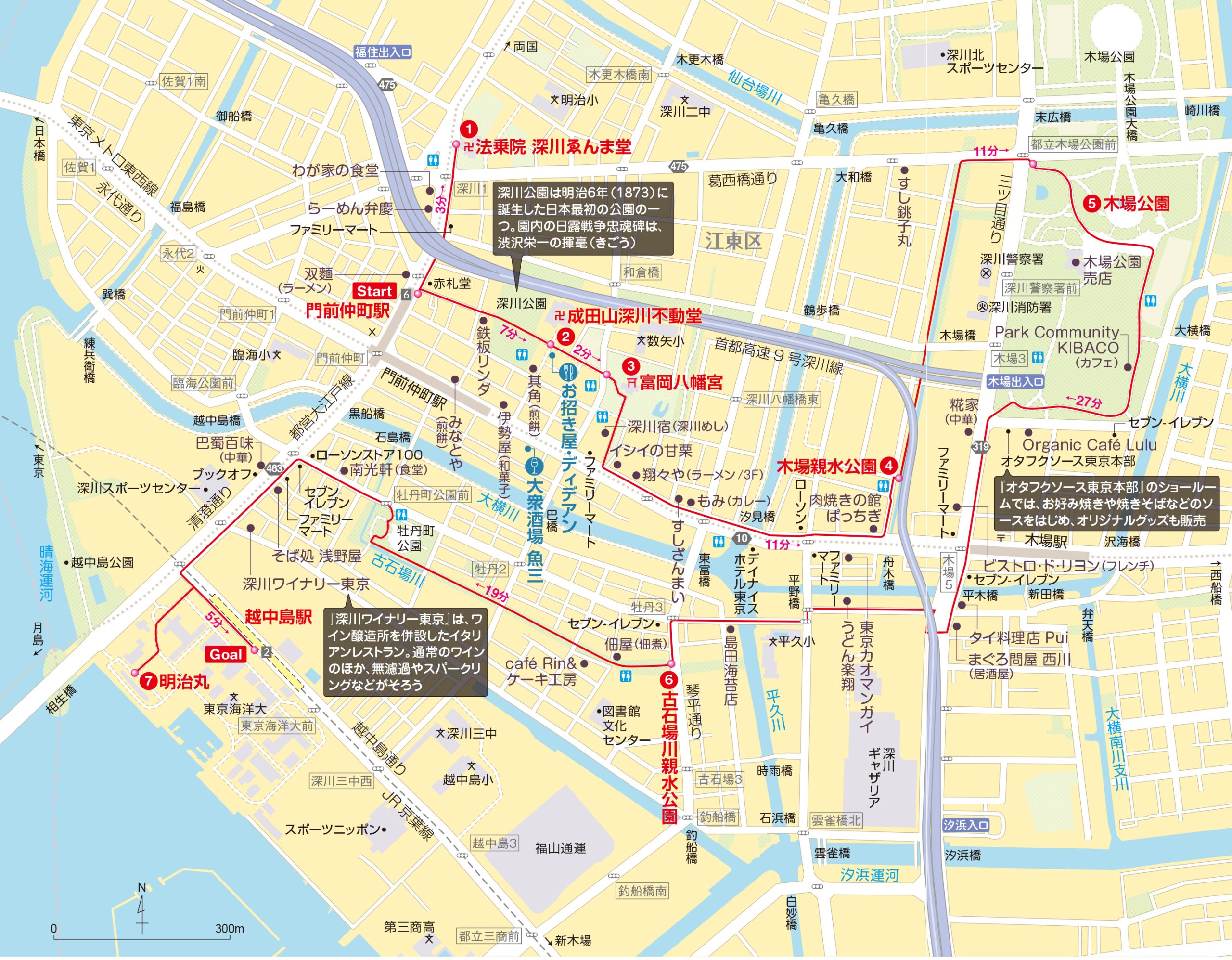 地下鉄東西線・大江戸線門前仲町駅→(3分/0.2㎞)→法乗院 深川ゑんま堂→(7分/0.5㎞)→成田山深川不動堂→(2分/0.1㎞)→富岡八幡宮→(11分/0.8㎞)→木場親水公園→(11分/0.9㎞)→木場公園→(27分/1.8㎞)→古石場川親水公園→(19分/1.3㎞)→明治丸→(5分/0.4㎞)→JR京葉線越中島駅