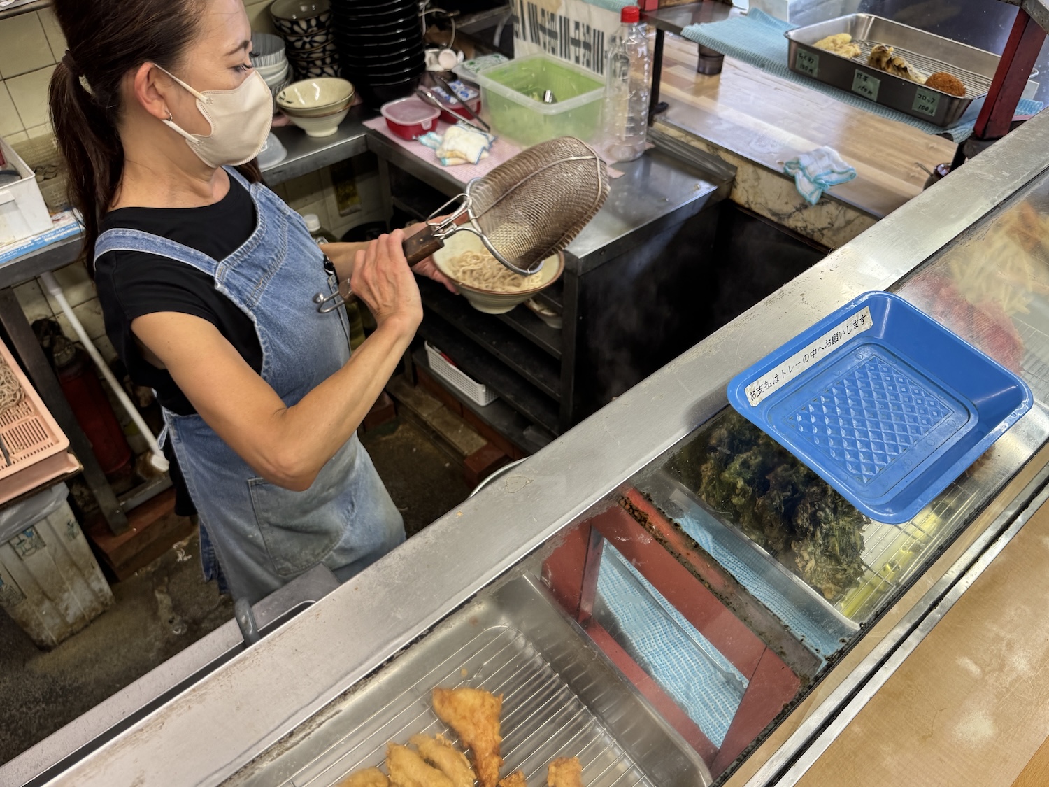 『六文そば』の名を冠した立ち食いそば店は現在、都内に中延店・須田町店・人形町店・日暮里店・金杉橋店の5店がある。 チェーンではなく、同じルーツを持つ独立した店舗で、げそ天が看板メニュー、昔ながらの味わいのそばを提供している(日暮里店は少し趣が違う)。それぞれ40年以上の歴史がある古い店だが、中延店は最近、げそ天そばが進化を遂げ、ファンから注目されているのだ。