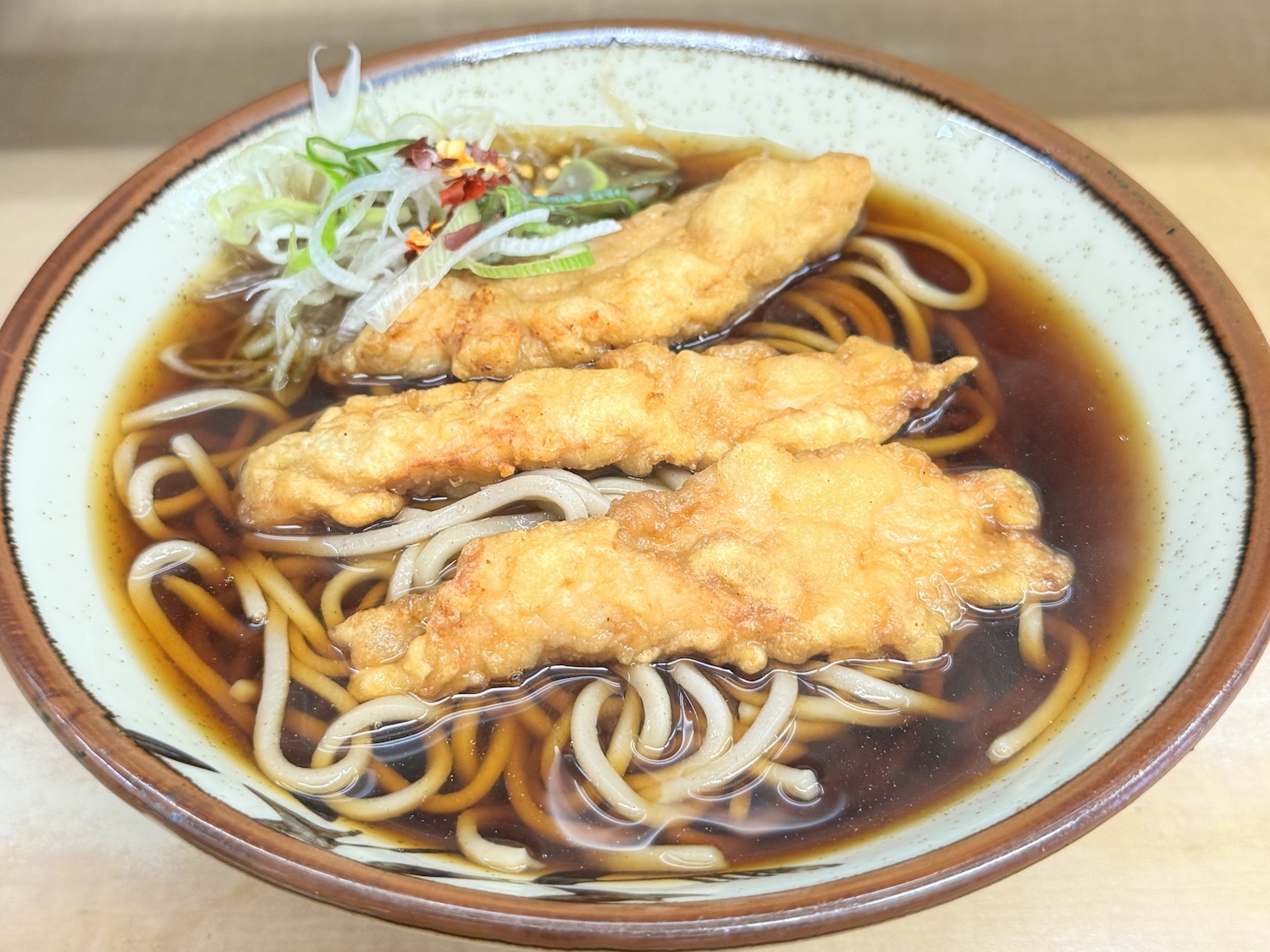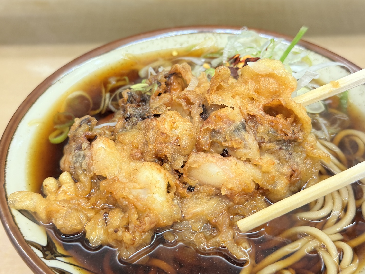 どんなげそ天か? まずでかいのだ。天ぷら自体も大きいが、中に入っているゲソも大粒。プリッとしたゲソは塩梅よく揚げられていて柔らか。ツユをじっくりしみこませてかぶりつけば、ダシかえしの風味とゲソの旨味があいまって、奥深いうまさが口中に広がっていく。こんなげそ天は、ちょっとほかでは食べたことがない。
