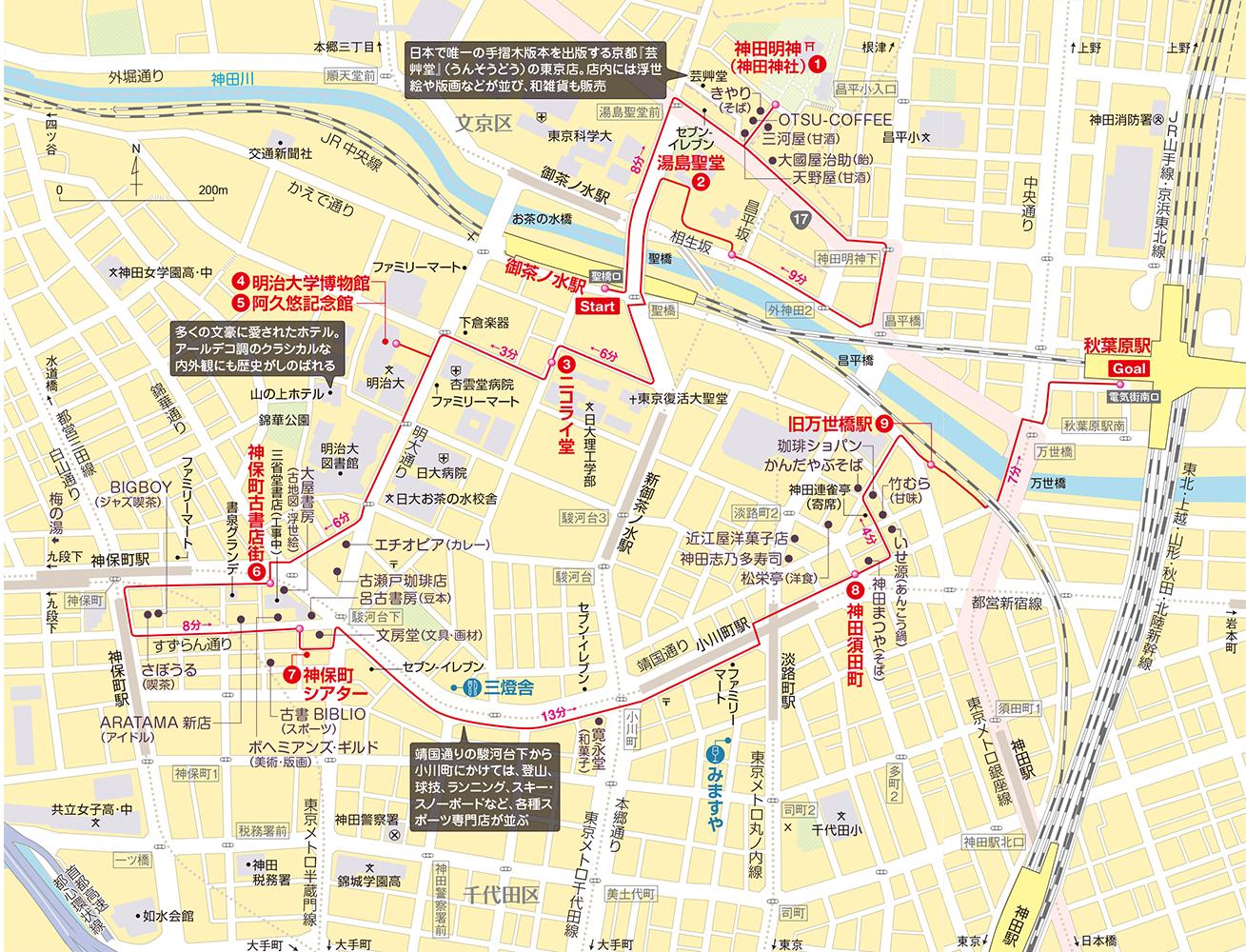 JR中央線・総武線・地下鉄丸ノ内線御茶ノ水駅→(8分/0.5㎞)→神田明神(神田神社)→(9分/0.6㎞)→湯島聖堂→(6分/0.4㎞)→ニコライ堂→(3分/0.2㎞)→明治大学博物館→(すぐ)→阿久悠記念館→(6分/0.4㎞)→神保町古書店街→(8分/0.5㎞)→神保町シアター→(13分/0.9㎞)→神田須田町→(4分/0.3㎞)→旧万世橋駅→(7分/0.5㎞)→JR・地下鉄・私鉄・つくばエクスプレス秋葉原駅