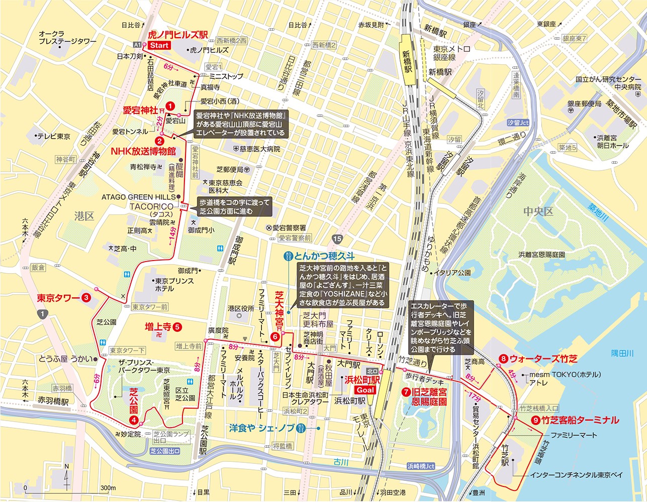 地下鉄日比谷線虎ノ門ヒルズ駅→(6分/0.4㎞)→愛宕神社→( 2分/0.1㎞)→NHK放送博物館→(14分/0.9㎞)→東京タワー→(10分/0.7㎞)→芝公園→(9分/0.6㎞)→増上寺→(6分/0.4㎞)→芝大神宮→(8分/0.5㎞)→旧芝離宮恩賜庭園→(8分/0.5㎞)→ウォーターズ竹芝→(4分/0.2㎞)→竹芝客船ターミナル→(17分/1.1㎞)→JR山手線・東京モノレール浜松町駅