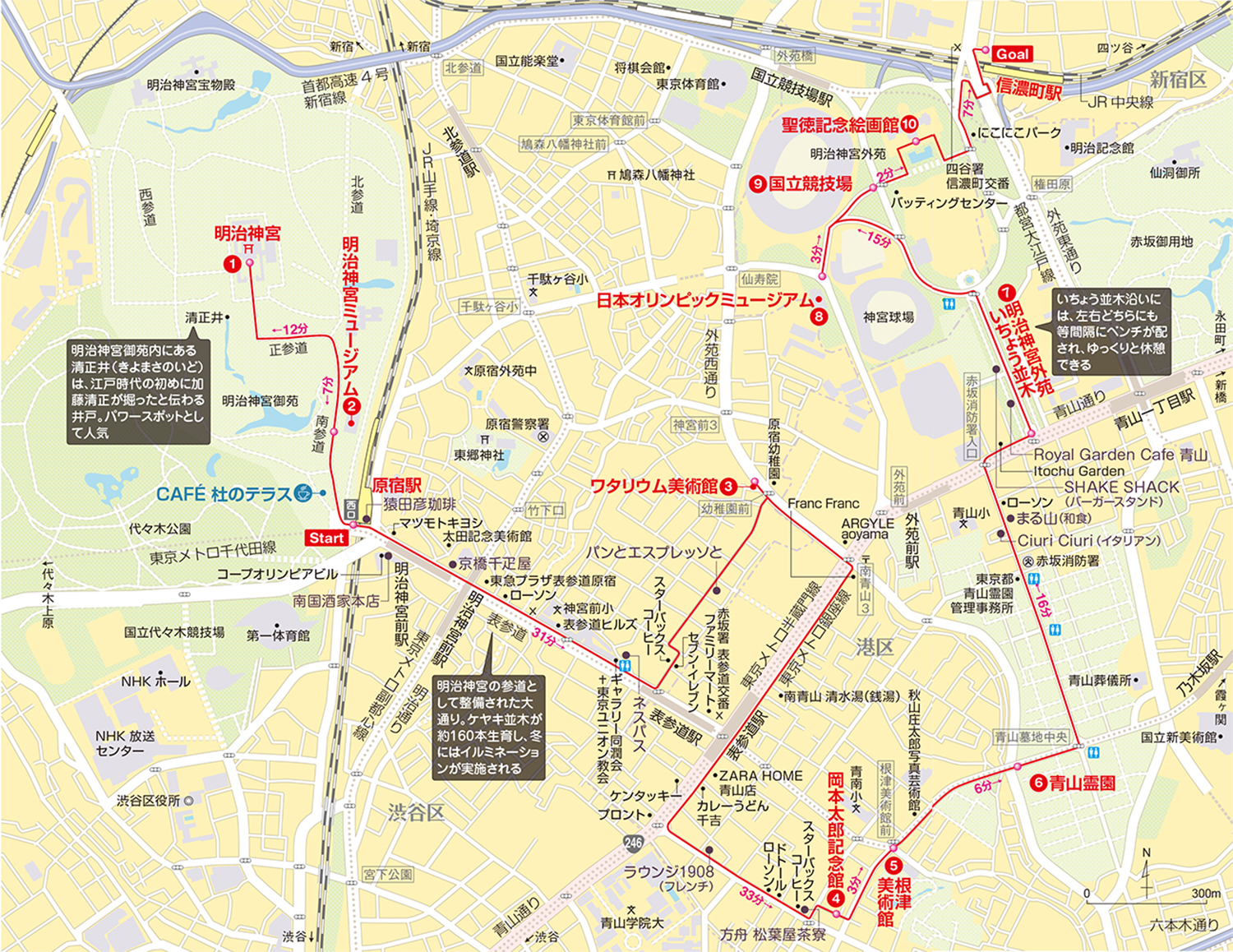 JR山手線原宿駅→(12分/0.8㎞)→明治神宮→(7分/0.5㎞)→明治神宮ミュージアム→(31分/1.7㎞)→ワタリウム美術館→(33分/1.8㎞)→岡本太郎記念館→(3分/0.2㎞)→根津美術館→(6分/0.4㎞)→青山霊園→(16分/1.0㎞)→明治神宮外苑いちょう並木→(15分/1.0㎞)→日本オリンピックミュージアム→(3分/0.3㎞)→国立競技場→(2分/0.1㎞)→聖徳記念絵画館→(7分/0.4㎞)→JR中央線信濃町駅