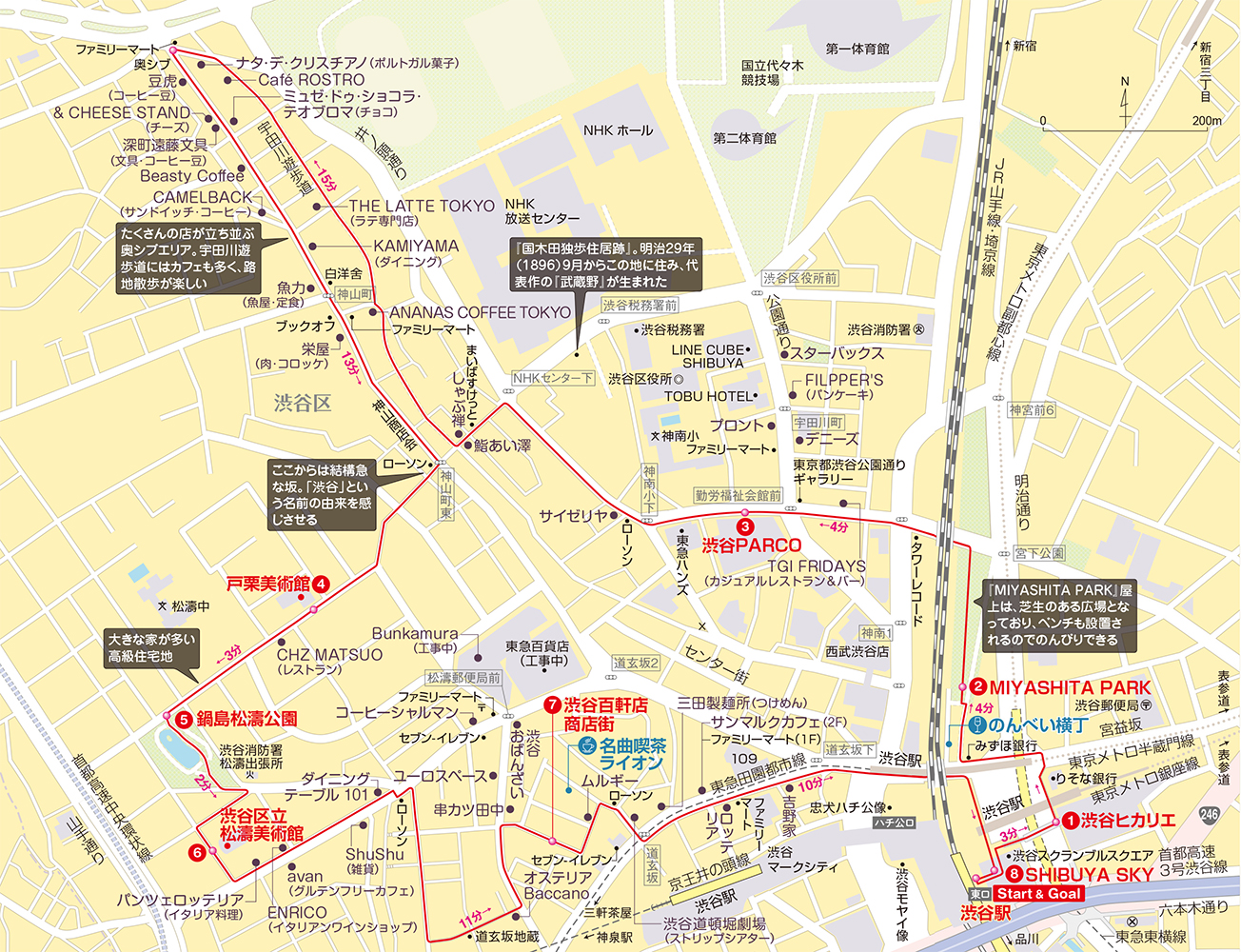 JR・地下鉄・私鉄渋谷駅→(3分/0.2㎞)→渋谷ヒカリエ→(4分/0.3㎞)→MIYASHITA PARK→(4分/0.3㎞)→渋谷PARCO→(15分/1.0㎞)→奥シブ→(13分/0.9㎞)→戸栗美術館→(3分/0.2㎞)→鍋島松濤公園→(2分/0.2㎞)→渋谷区立松濤美術館→(11分/0.8㎞)→渋谷百軒店商店街→(10分/0.7㎞)→SHIBUYA SKY→(すぐ)→JR・地下鉄・私鉄渋谷駅