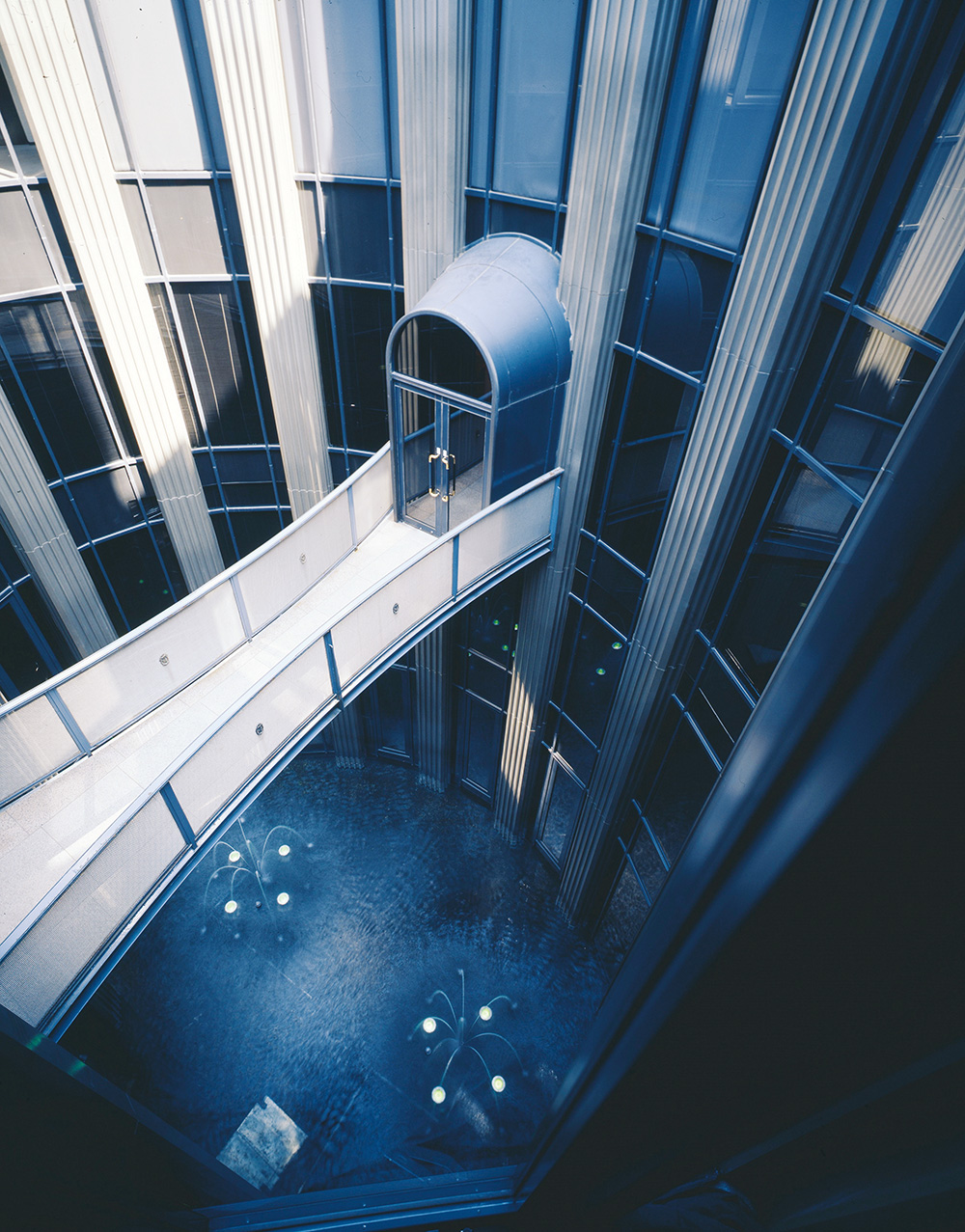 ファッション、劇場、ギャラリーなど、「今」が感じられる複合商業施設。建物の外周を階段が回り込む立体街路も特徴で、途中には広場や植栽エリアが点在する。