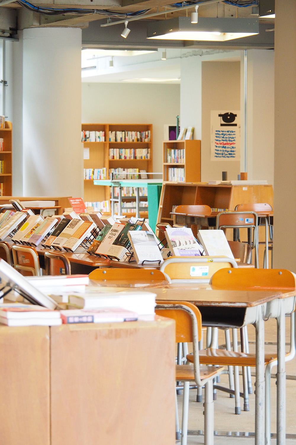 メインエントランスにはブックラウンジが広がり、教室だった場所にはオフィスやコワーキングスペース、子供向けのクリエイティブラーニングスクールも。