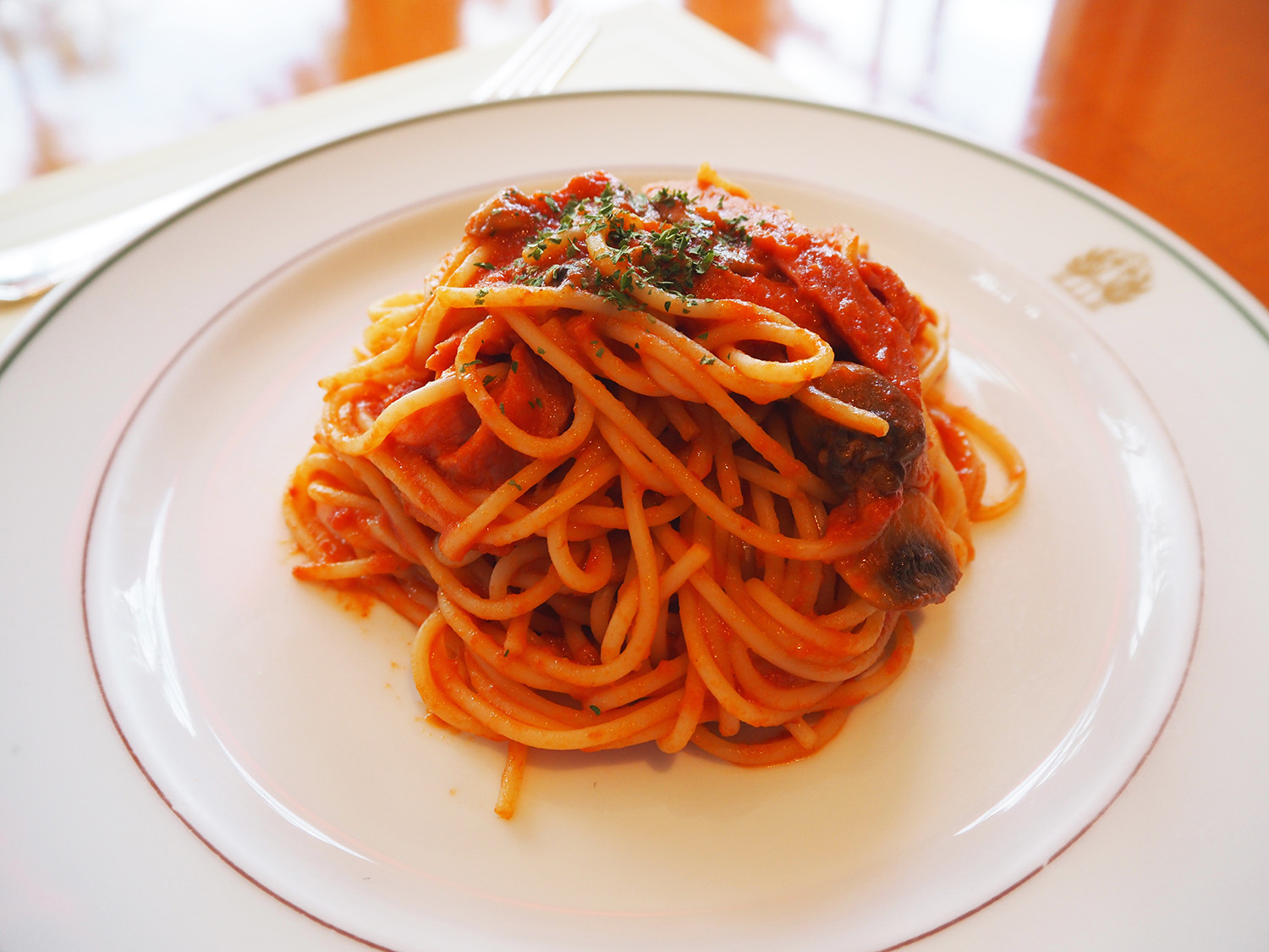 やはりケチャップが入っていないために、味に尖りがなく、マイルド。なにより、トマト自体の味がする。生トマトと水煮の両方が使われているためだ。マッシュルーム、たまねぎとともに、肉の味がしっかりするハムもふんだんに使われておりボリュームも申し分なし。味付けは全体として、バターのコクがしっかりありながら、決して脂っこくもない。建築同様、やはり気品があるのだ。