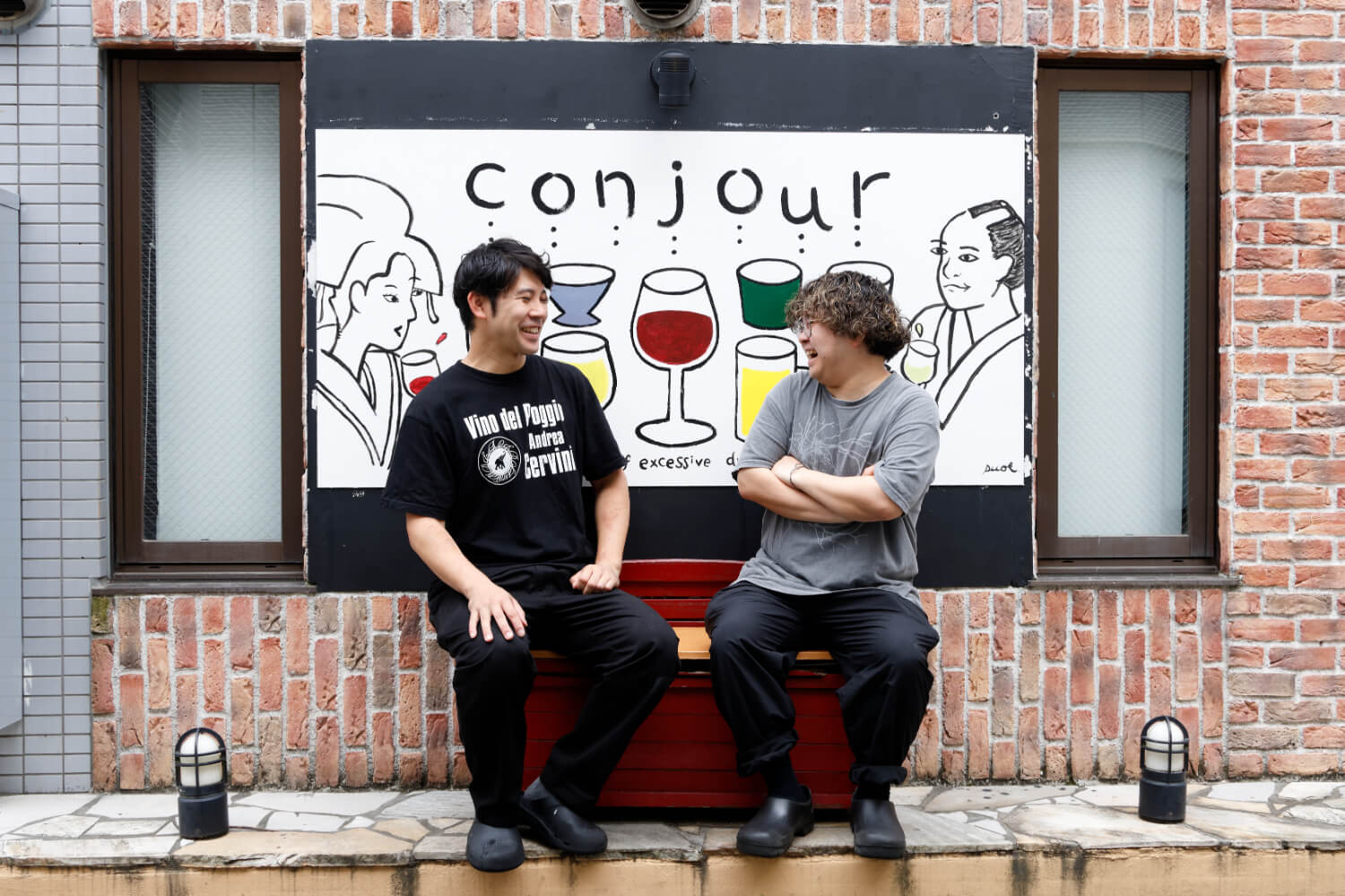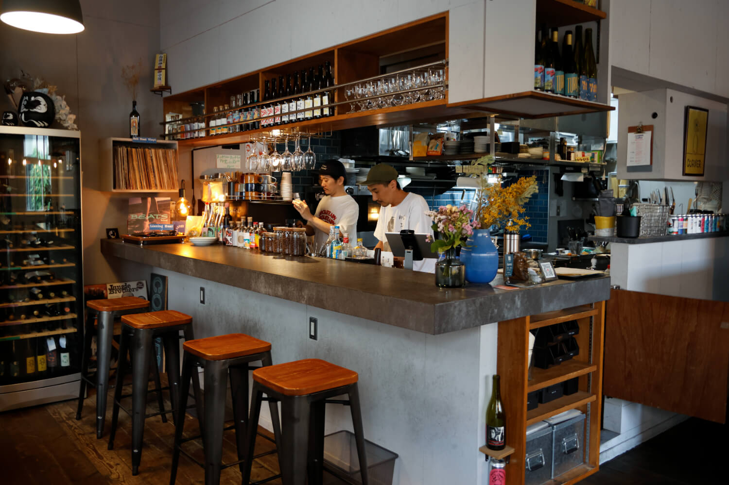 壁一面を埋め尽くすボトルの数、およそ500本。ここは……ナチュラルワインのライブラリー!? 「姉妹店『gotta』の在庫もあるので」とソムリエの米倉佳祐さんは控えめに語るが、この充実ぶりはだてではない。多彩なワインを引き立てる大島拓実さんの料理は、イタリアンにひとひねりを加えて。昆布水に漬けたキュウリにからすみをあしらったサラダなど、軽やかさと満足感が同居したメニューが揃う。「野菜をつまみにワインを飲むって、なんかかっこいいなと思って」と大島さん。午後3時からゆるりとスタートするから、昼飲み派にもうれしい。