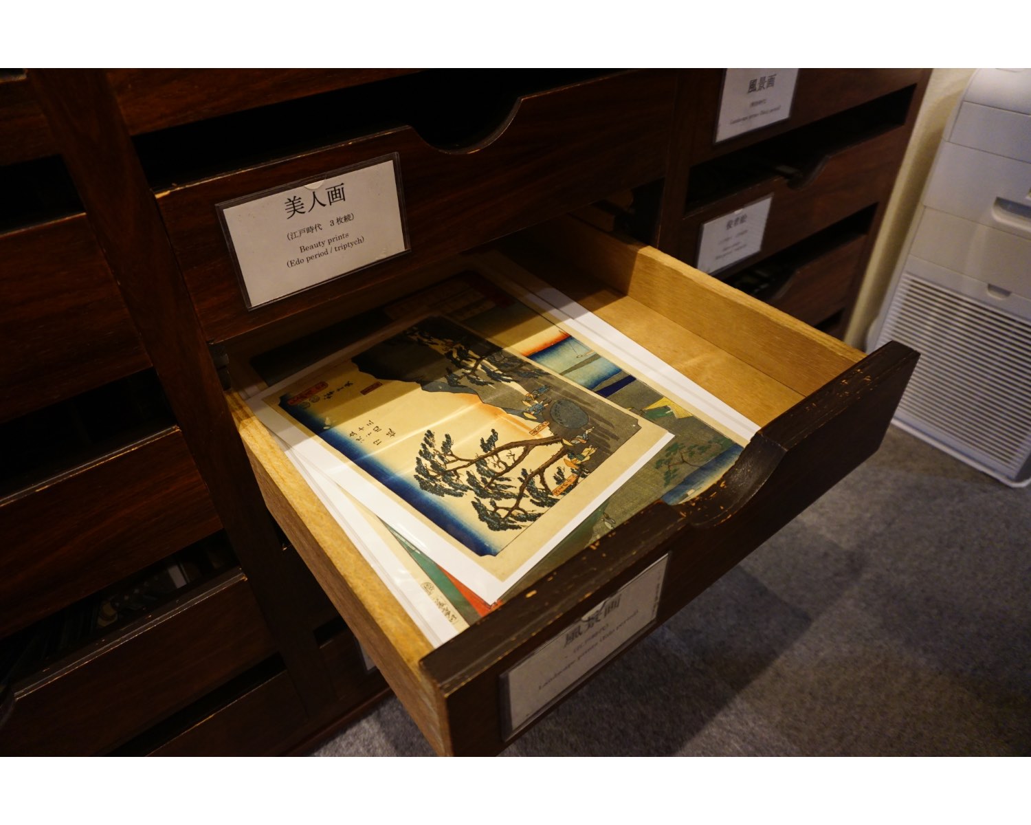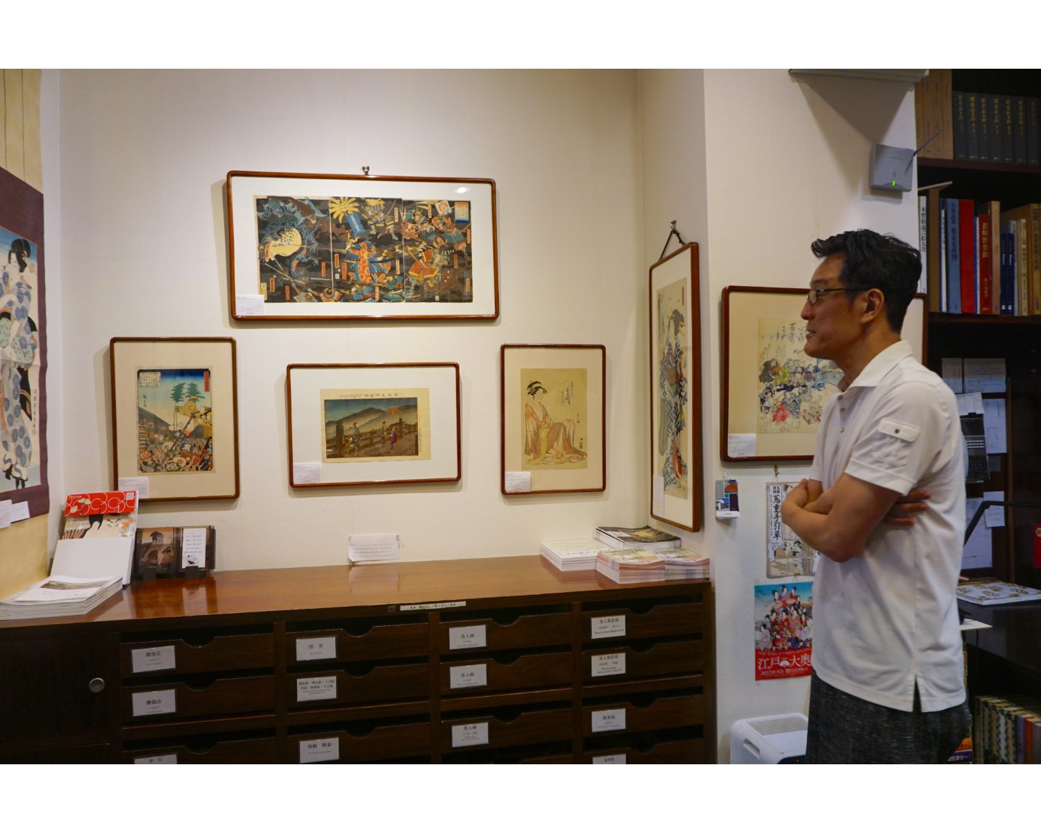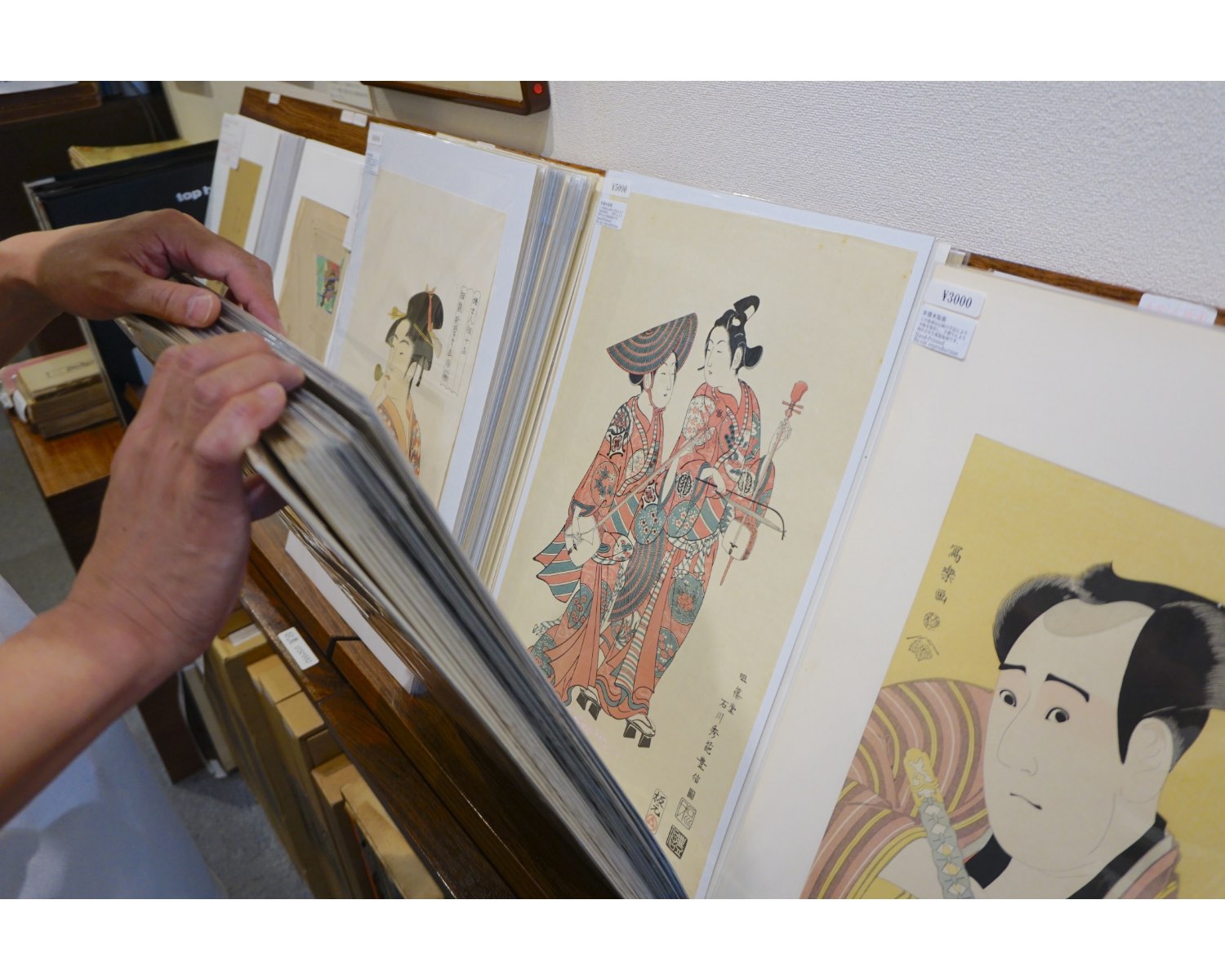 そしてこちらが、実際に浮世絵を購入できるスペース。壁に掛けられた浮世絵の下の棚では、ジャンルごとに引き出しが分けられており、自由に開けて作品を手に取り選ぶことができます。