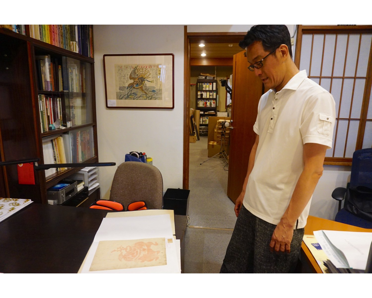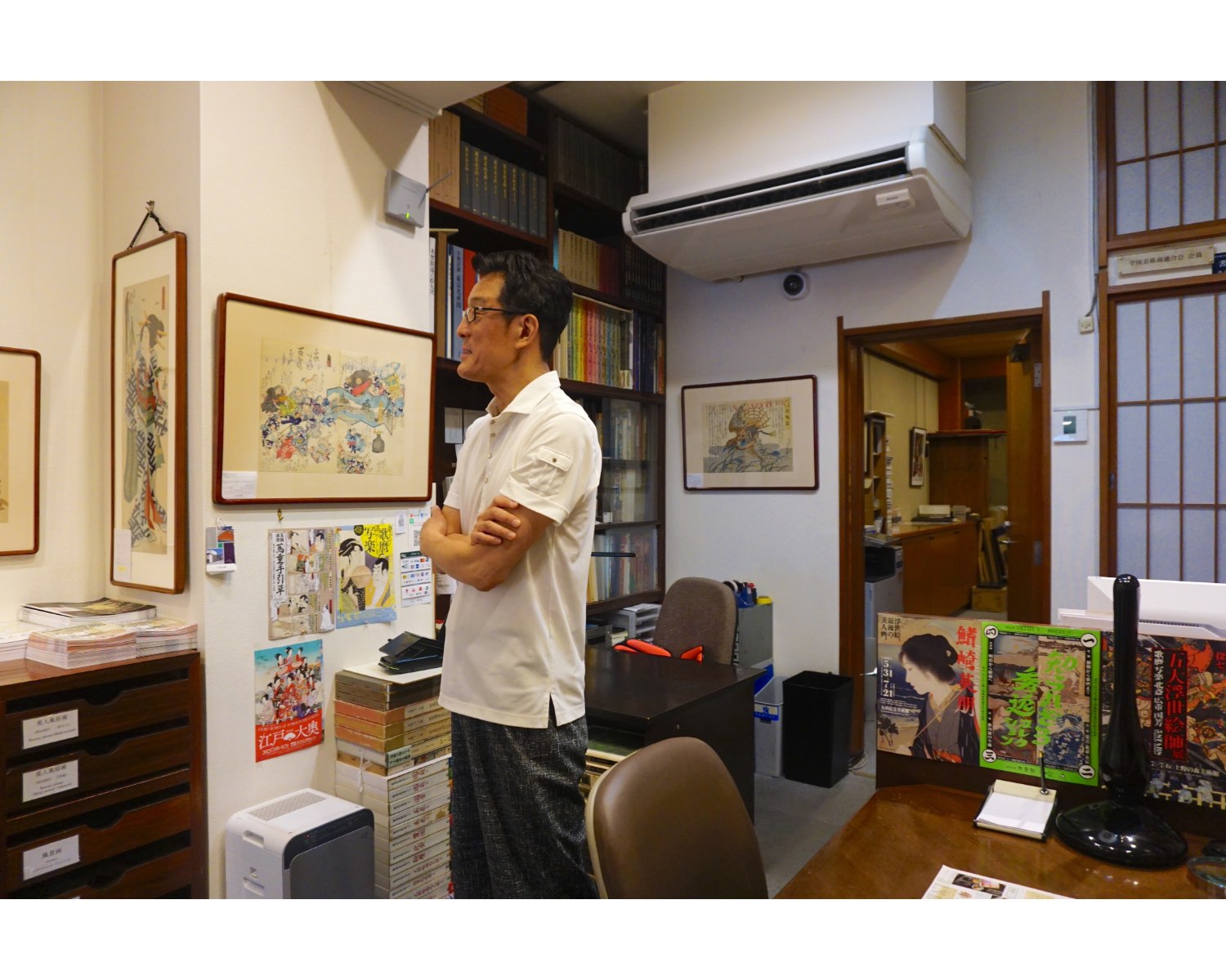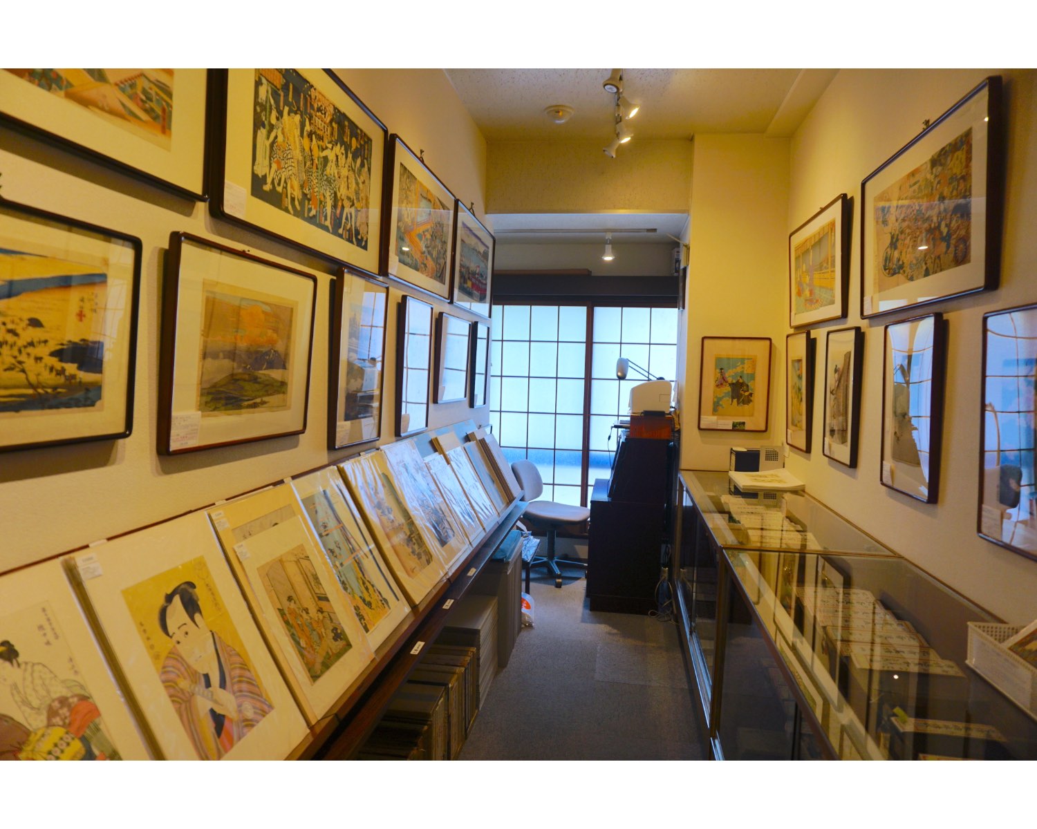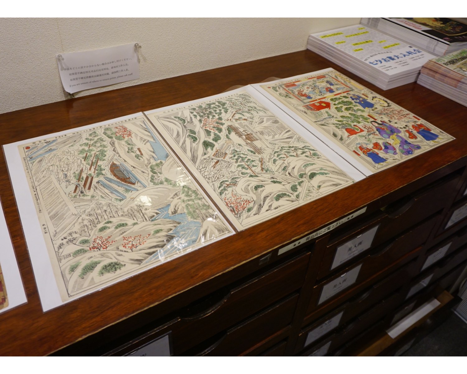 そしてこちらが、実際に浮世絵を購入できるスペース。壁に掛けられた浮世絵の下の棚では、ジャンルごとに引き出しが分けられており、自由に開けて作品を手に取り選ぶことができます。
