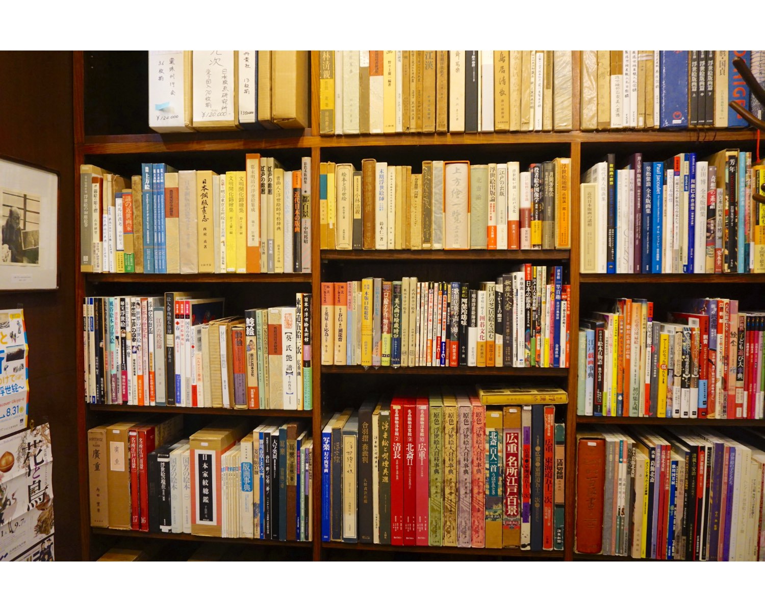 もっと手頃な価格のものが欲しいという人は、お店の奥へ。斜めに立てかけられた浮世絵がズラリと並んでいます。