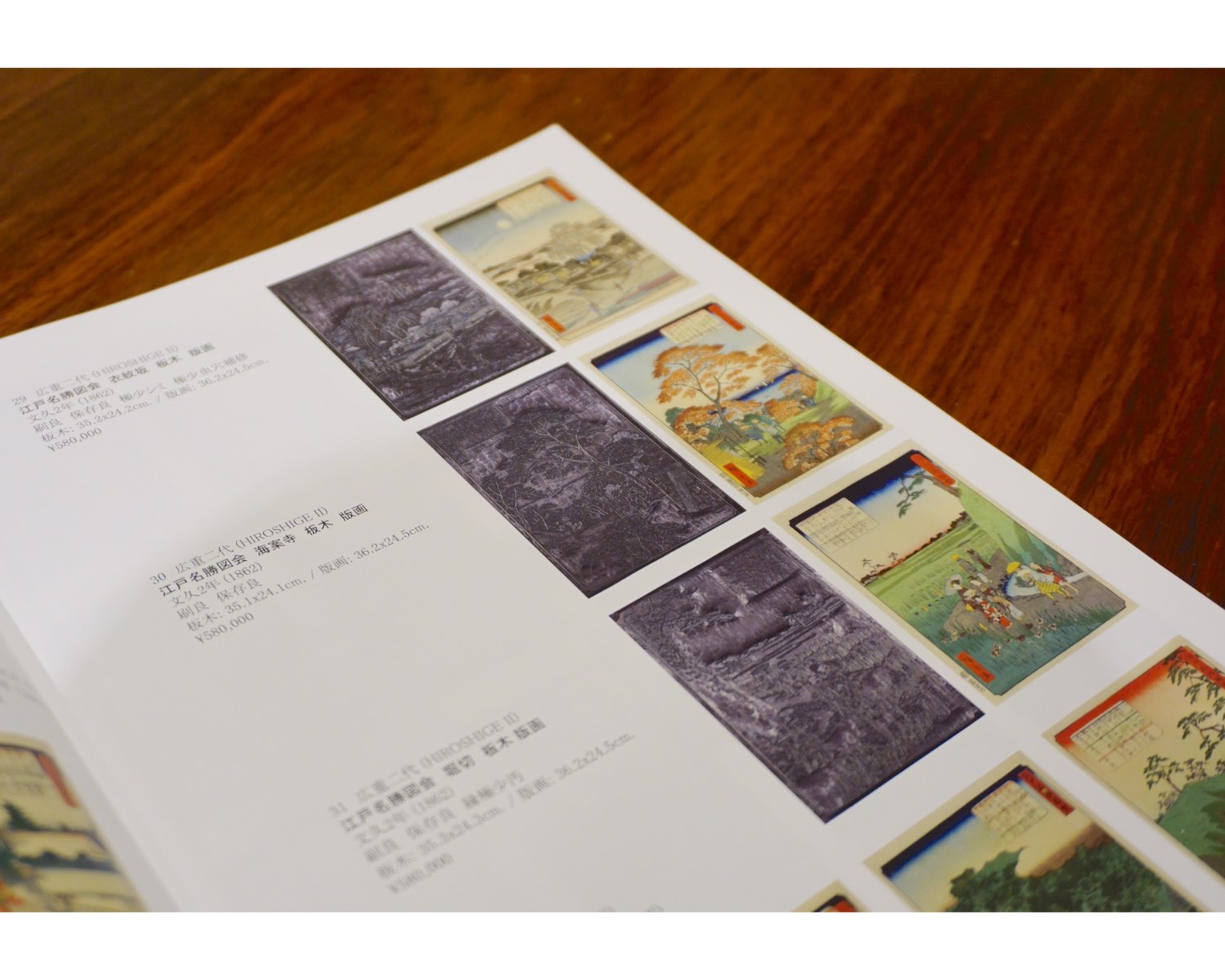 まれに江戸時代や明治時代に使われていた版木が出てくることもあるそうですが、せいぜい数年に1つ出るかどうかというくらい珍しいことなのだとか。こちらのカタログに掲載されている版木は、3枚セットで扉に仕立てられていた状態で発見されたのだそう。