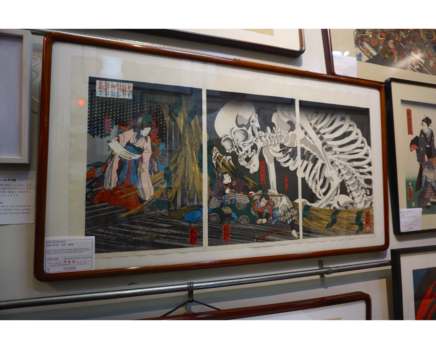 こちらのコーナーでは、レコード店で買い物するときのように、パタパタと繰り出しながら浮世絵を選ぶことができます。値札を見ると、3000円、4000円、5000円といった手に取りやすい価格が。こちらは、元になる浮世絵の図版をもとに下絵を起こして、現代に新たに彫り直した版木(はんぎ)で刷ったものなのだそうです。