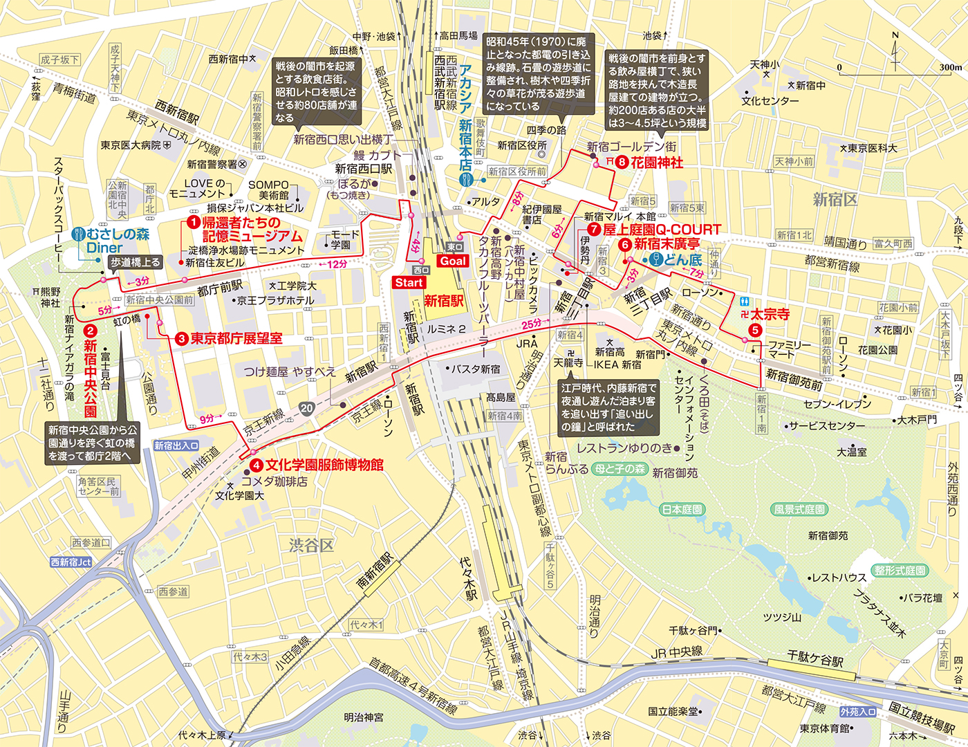 JR・私鉄・地下鉄新宿駅→(4分/0.2㎞)→新宿西口思い出横丁→(12分/0.8㎞)→帰還者たちの記憶ミュージアム→(3分/0.2㎞)→新宿中央公園→(5分/0.5㎞)→東京都庁展望室→(9分/0.6㎞)→文化学園服飾博物館→(25分/1.7㎞)→太宗寺→(7分/0.5㎞)→新宿末廣亭→(3分/0.2㎞)→屋上庭園「Q-COURT」→(6分/0.4㎞)→花園神社→(3分/0.2㎞)→新宿ゴールデン街→(8分/0.5㎞)→JR・私鉄・地下鉄新宿駅