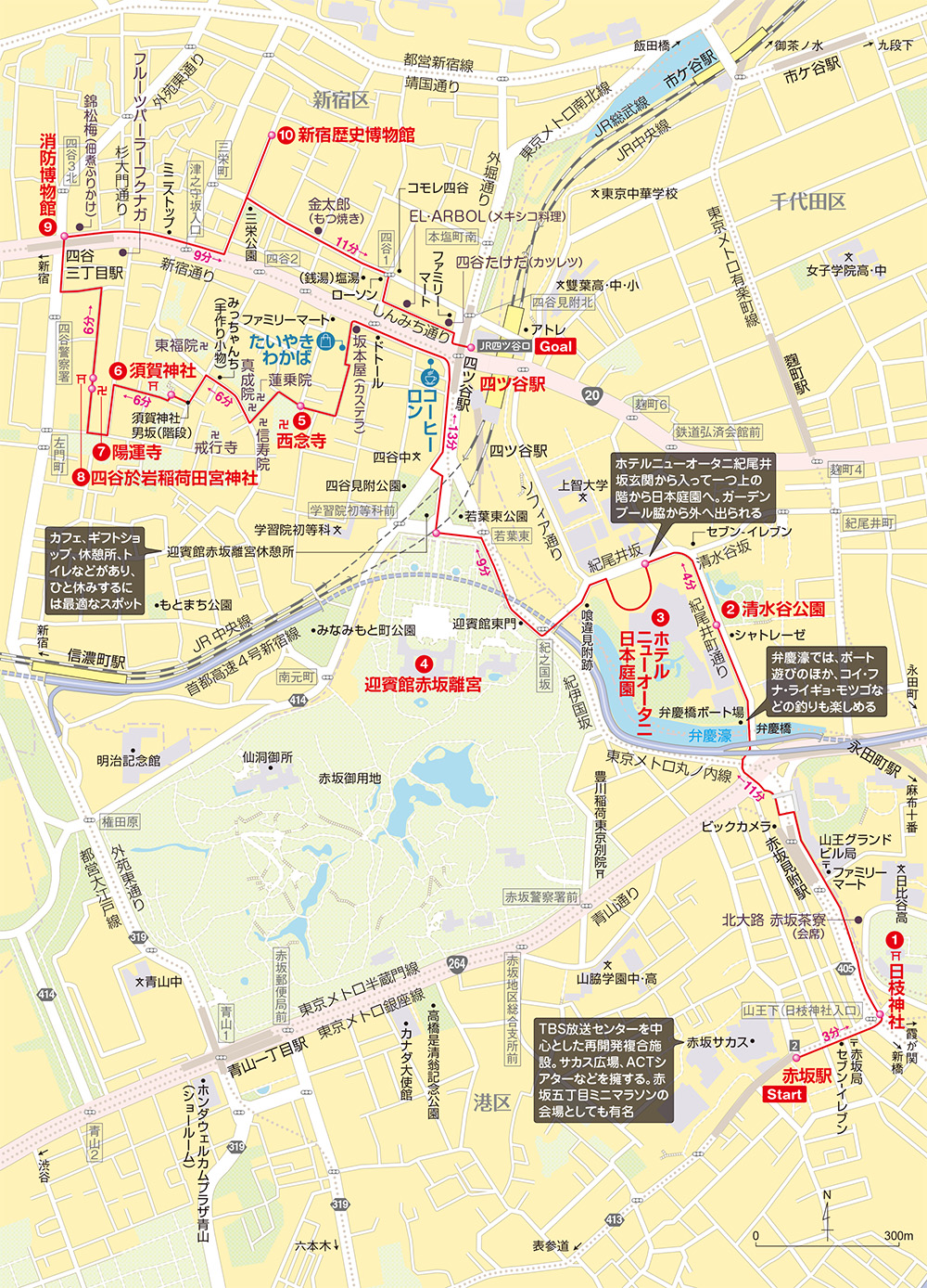 地下鉄千代田線赤坂駅→(3分/0.2㎞)→日枝神社→(11分/0.7㎞)→弁慶橋→(4分/0.2㎞)→清水谷公園→(4分/0.3㎞)→ホテルニューオータニ日本庭園→(9分/0.6㎞)→迎賓館赤坂離宮→(13分/0.9㎞)→西念寺→(6分/0.4㎞)→須賀神社→(6分/0.4㎞)→陽運寺→(すぐ)→四谷於岩稲荷田宮神社→(6分/0.4㎞)→消防博物館→(9分/0.6㎞)→新宿歴史博物館→(11分/0.7㎞)→JR中央線・地下鉄丸ノ内線四ツ谷駅