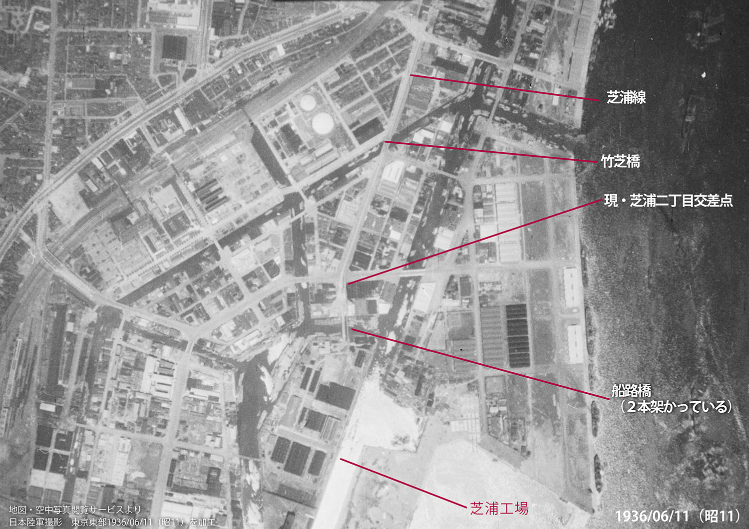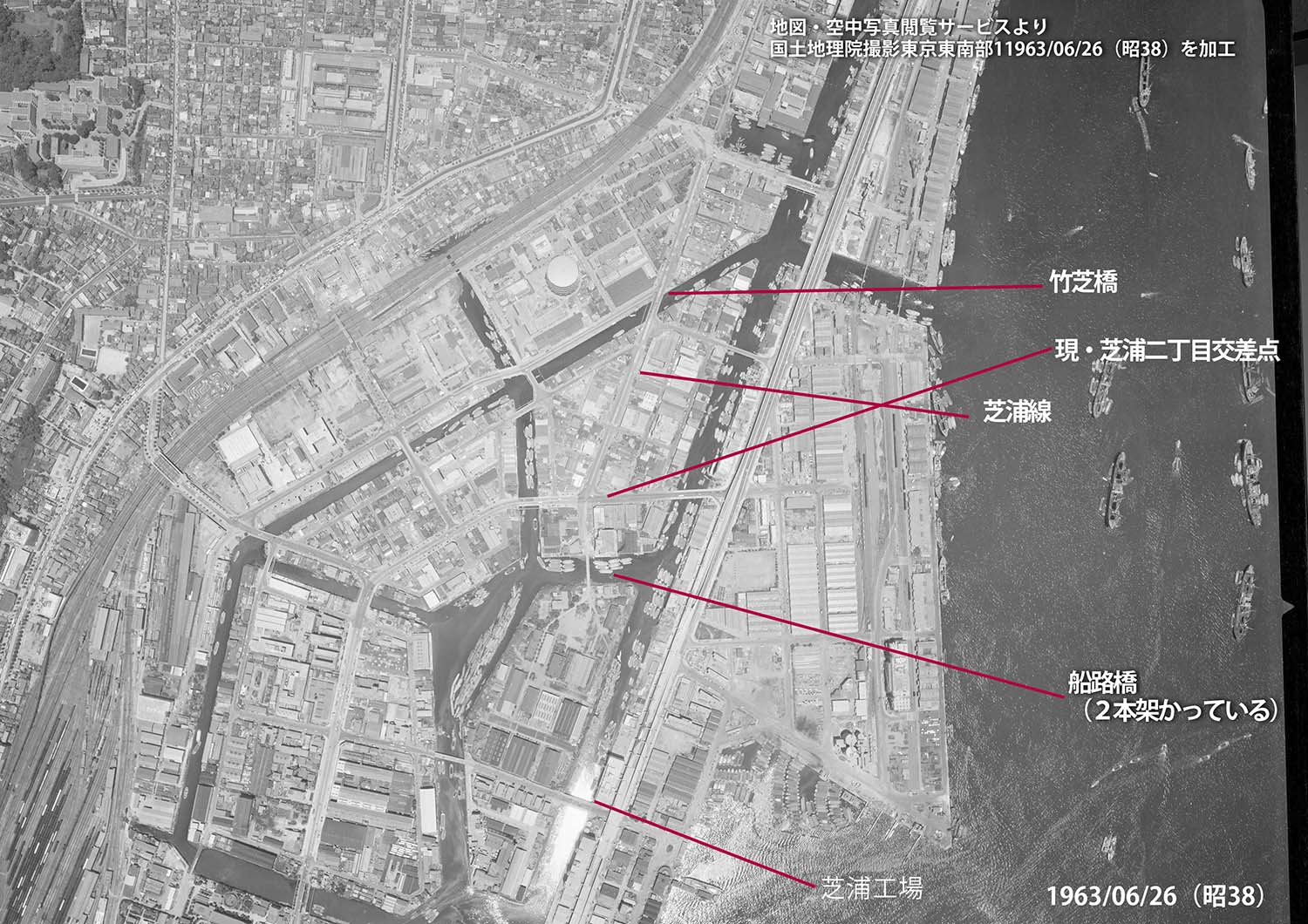 現在の地図で辿ると、芝四丁目交差点から国道130号を辿ってJRのガードを潜り、芝浦一丁目交差点で右折。旧海岸通りを南下して竹芝橋を渡り(竹芝橋から芝浦運河通りへと右折して田町駅芝浦口付近へ至る都電の倉庫線もあった)、芝浦2丁目交差点へ突き当たります。芝浦線はそのまま直進して、運河を渡った先に芝浦工場がありました。