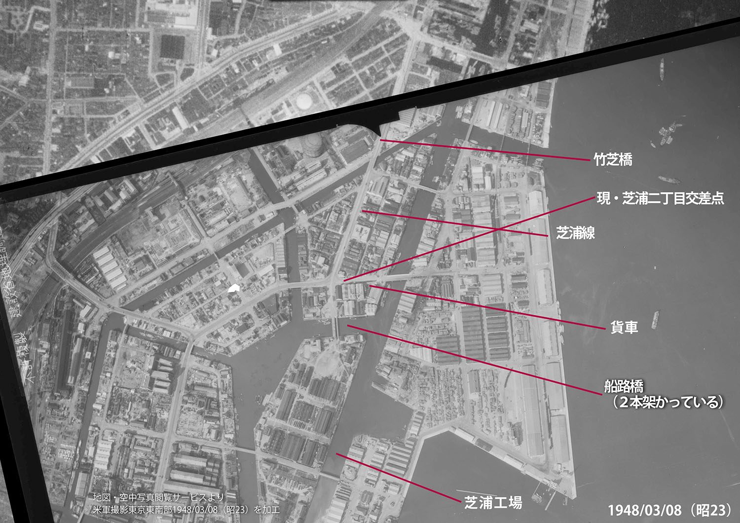 ということは、芝浦線は複線で、芝浦2丁目交差点を過ぎたところで単線になっていたのでしょうか。念のため終戦直後からの空中写真を見ましたが、東側へと分岐する軌道は見当たらず、複線~単線であると推測します。