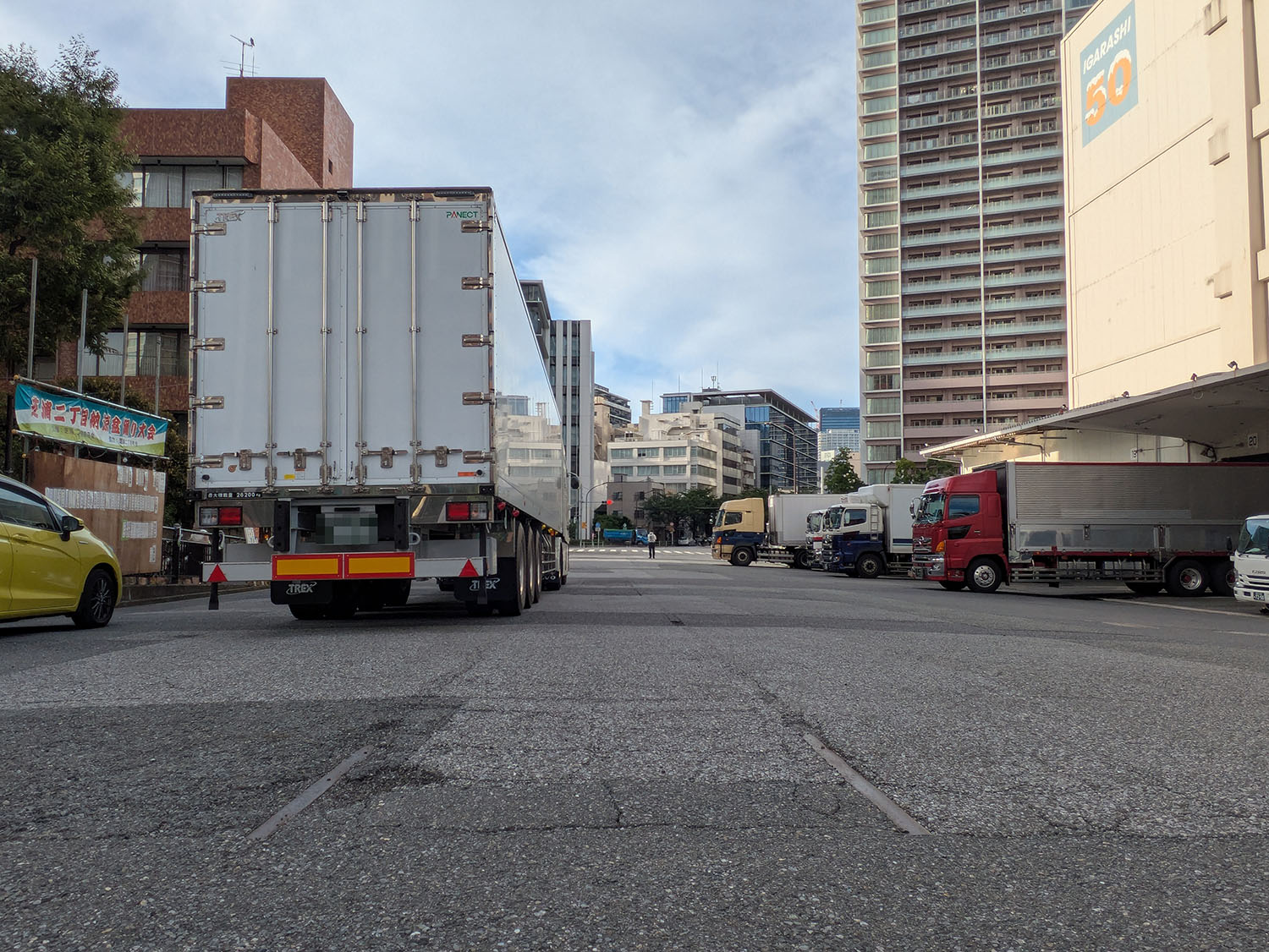 行き止まり道路の空間は、冷蔵倉庫のトラック転回エリアとなっており、日曜は倉庫も休みで静かな空間となっています。この道路に芝浦線の軌道が埋まっているのです。