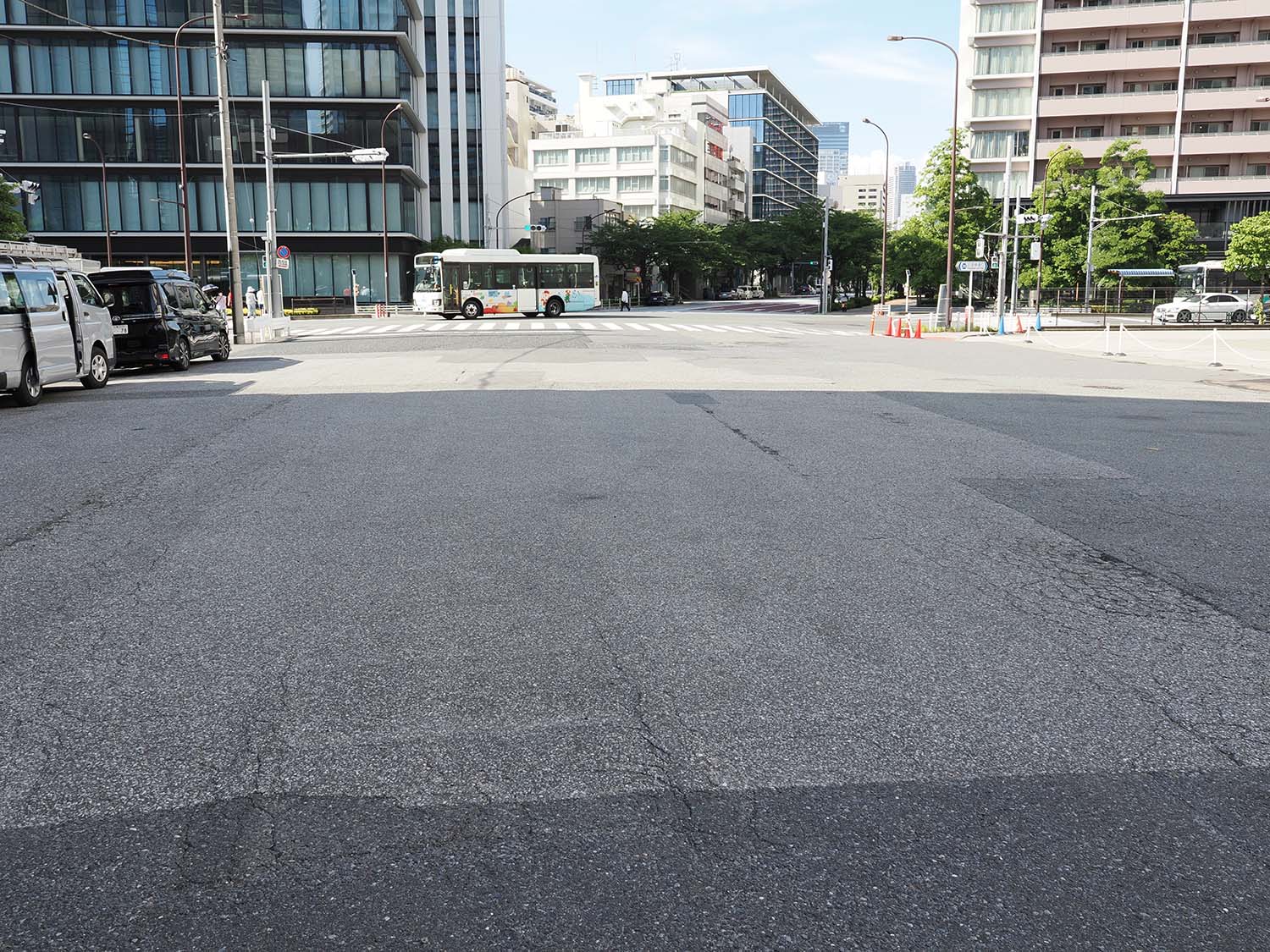 交差点の横断歩道付近から、道路をよーく凝視します。つぎはぎだらけのアスファルトを凝視していると、「あ…… 見えた」。2本のレールが分岐するポイントが、うっすらと見えてきました。ポイントの跡まで残っていることに驚きます。