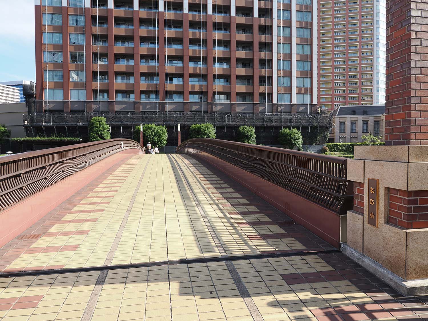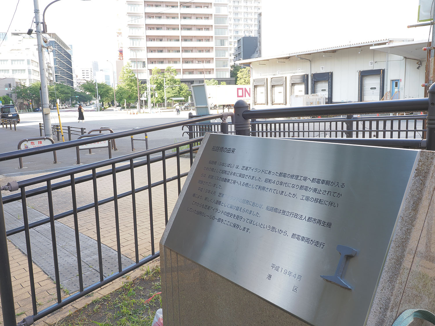 じっとアスファルトを見つめる私に気がついた地元の方が、道路脇の公園を指さします。説明板には芝浦工場と再開発への経緯が記され、当時のレール断面が保存されています。運河を渡った橋は「船路橋」といい、再開発される2007年頃までは軌道を残した状態で橋が架かっていました。その橋は既に存在せず、隣に人道橋の船路橋を再架橋しており、路面のタイルには2本のレールと枕木を模した意匠が施され、ここに都電があった歴史をさりげなく語っています。
