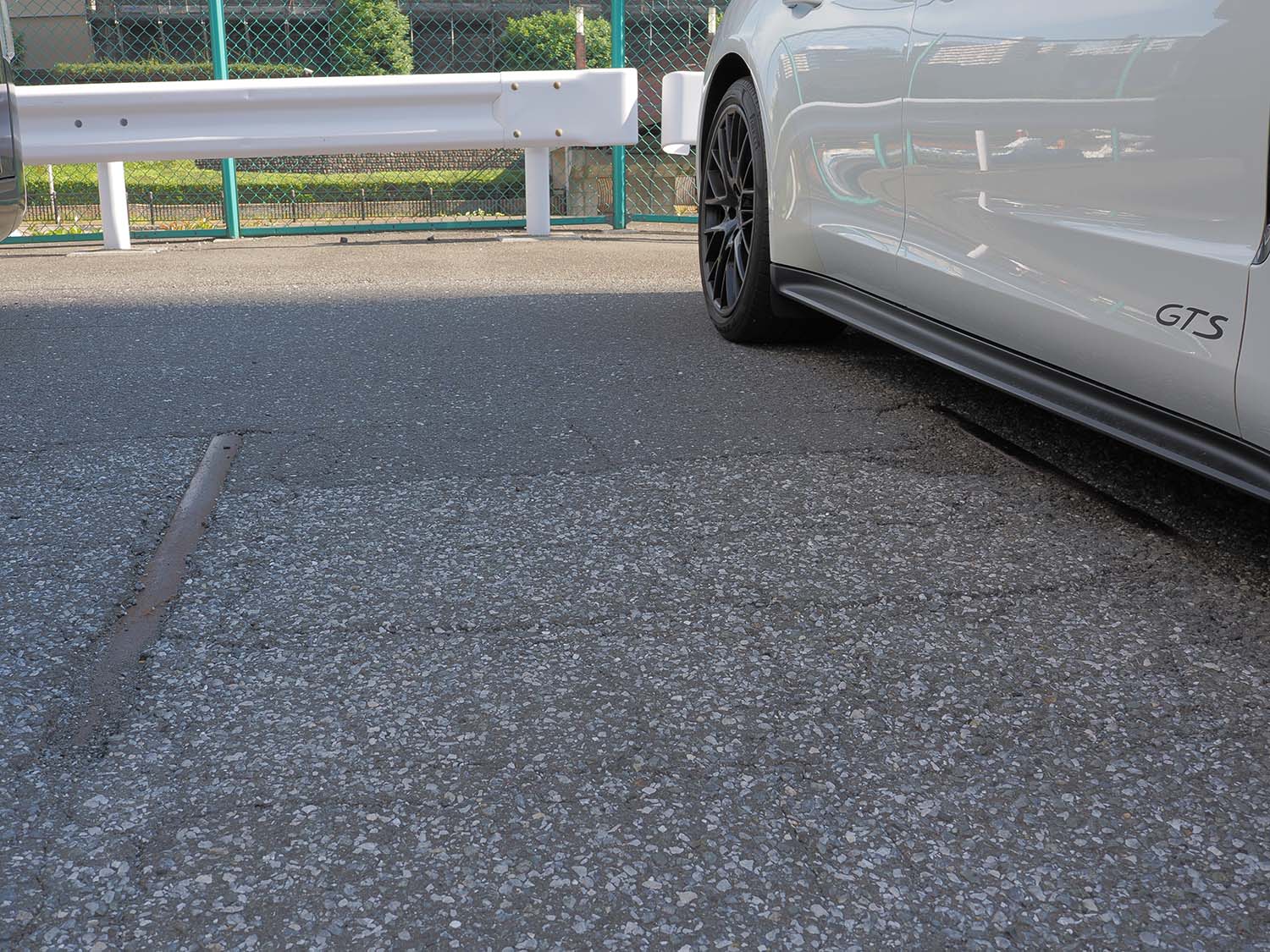 さて、軌道のヒビをゆっくり見つめながら歩いていきます。路駐してある車に阻まれたものの、その真下を見るとレールが露出している! 長さにしてわずか1m満たないものですが、たしかに2本のレールがアスファルトから現れていました。
