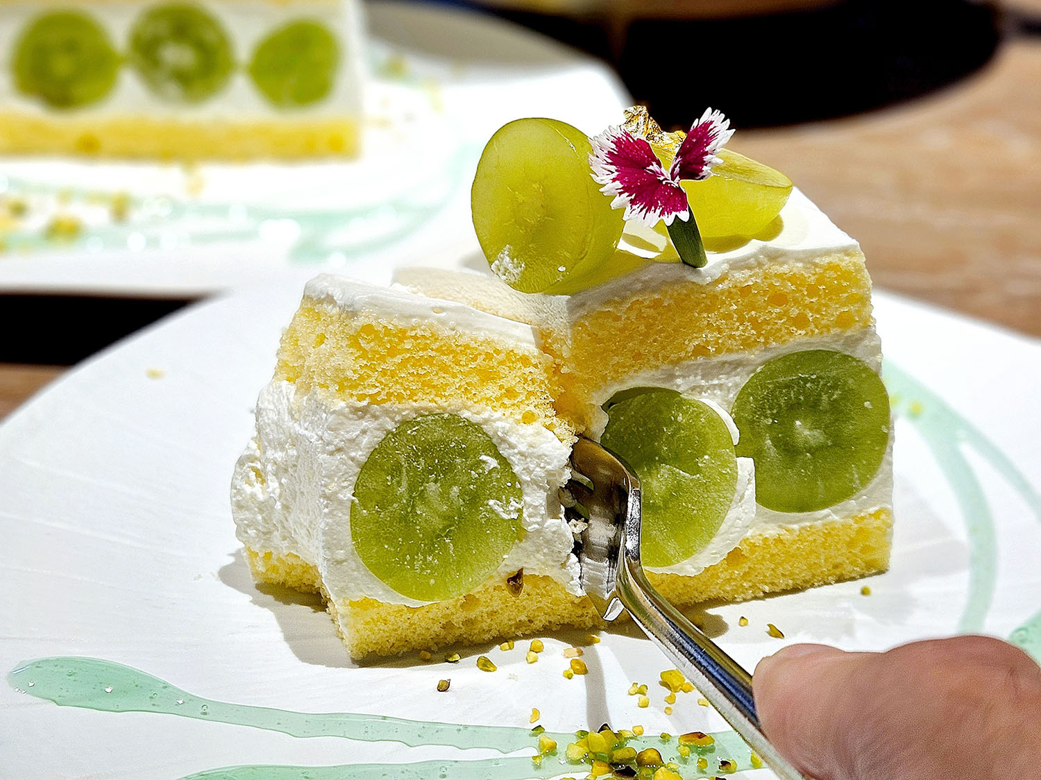 みずみずしいシャインマスカットのふんわりショートケーキは悶絶級のおいしさです。
