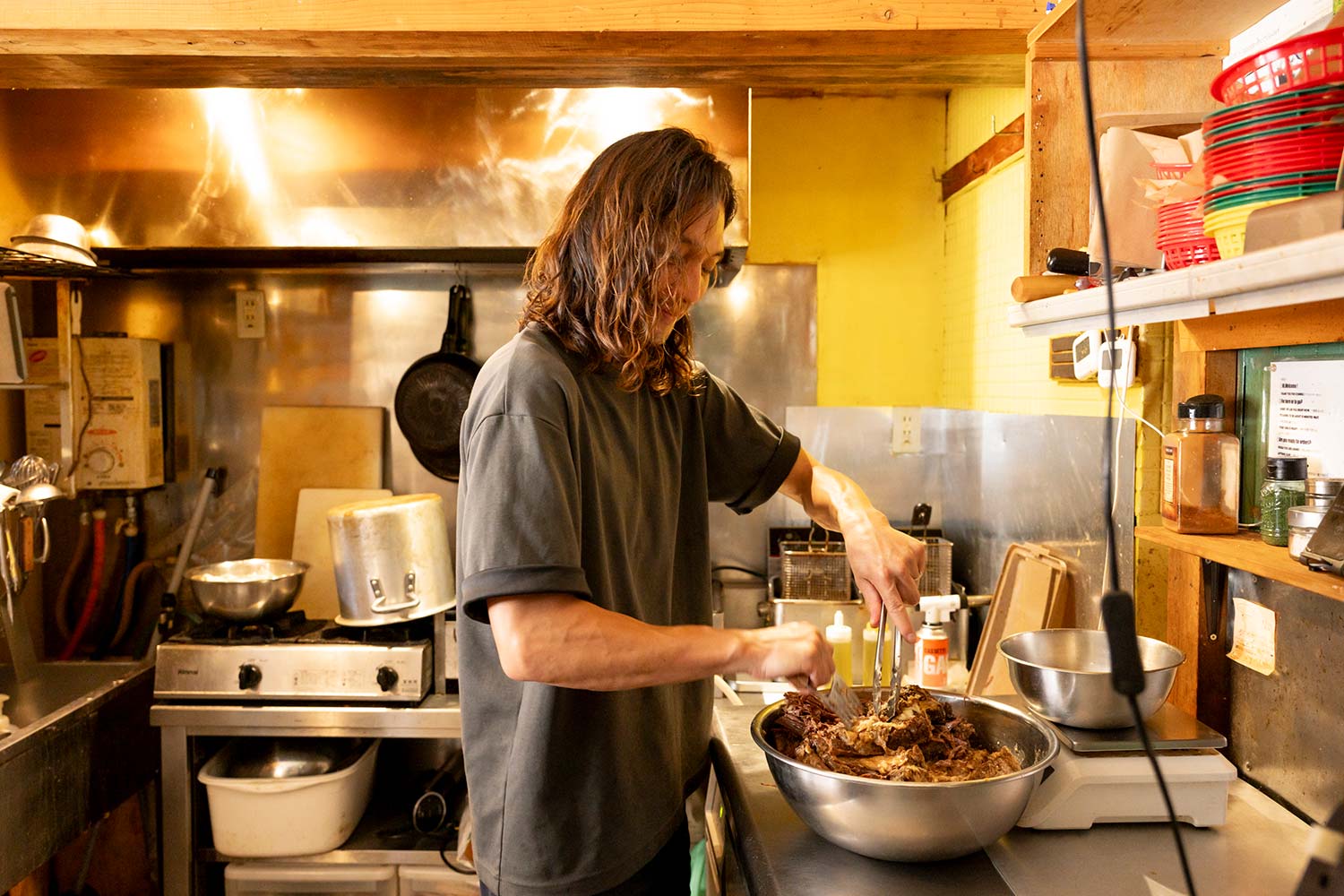 “ローカルハワイ”をコンセプトに、サンドイッチ&アサイーボウルを提供するカフェ。「ベーコンとタマネギをバルサミコ酢で煮詰めた、甘苦いベーコンジャムは女性におすすめ」と代表の添田亮さん。低温調理のチキン、野菜ともに。アサイーボウルは5種。サンセットハウピアボウルは、フルーツ100%のアサイーブレンドに、ココナッツアイス、バナナ、マンゴーをのせて。