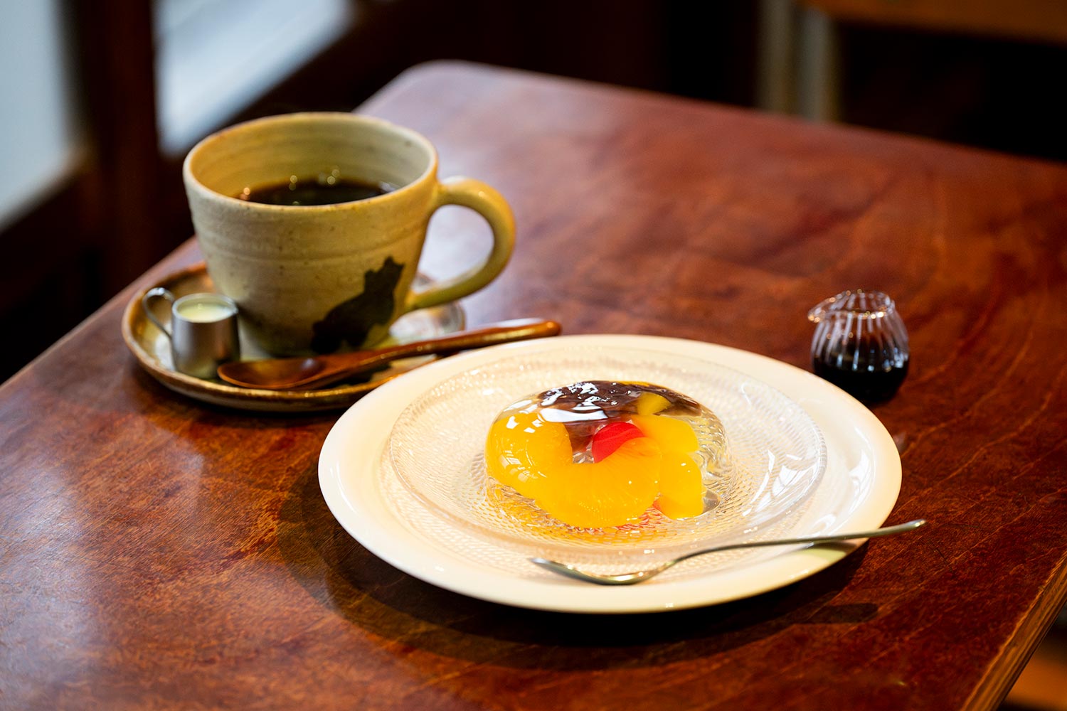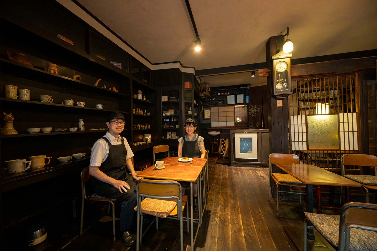 昭和2年(1927)に建てられた薬局の建物を改装した古民家カフェ。作り付けの薬棚は当時のままでペンキを塗り、現在は、陶器を飾るギャラリーとして使っている。柱時計も薬局時代のものだが今でも健在。「毎朝、ゼンマイを巻いています」と店主・山中明子さん。信州の寒天でフルーツと小豆から炊いたあんこを包んだあんみつ玉など、メニューはすべてお手製だ。