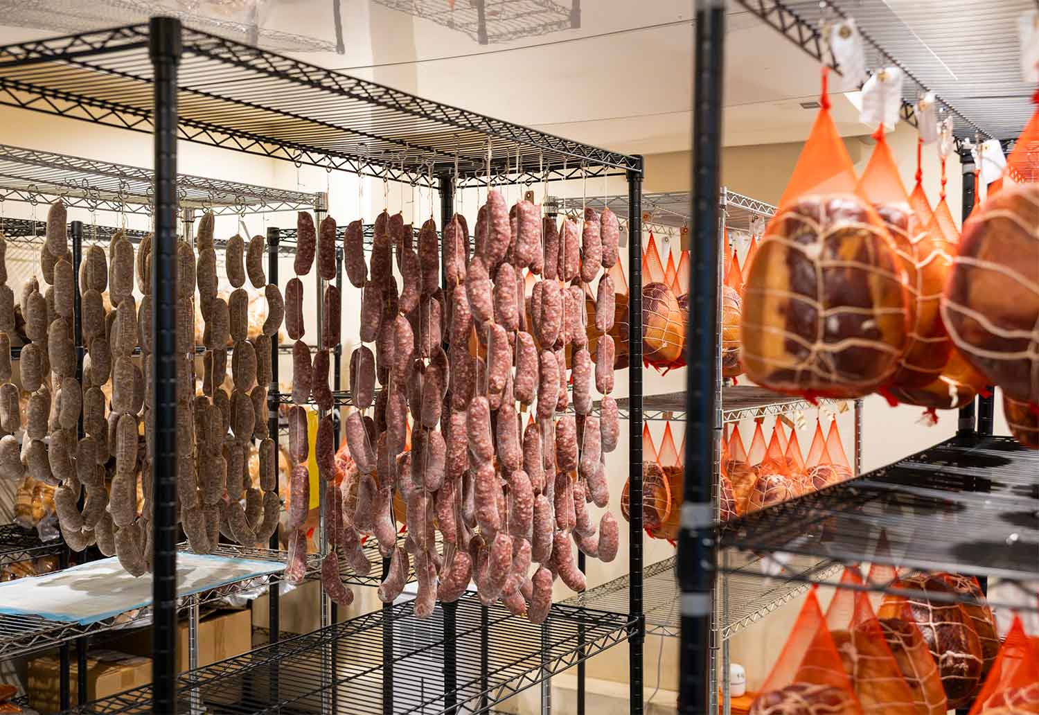 都内では珍しいサラミと生ハムの工房兼店舗。カウンター奥に熟成室があり、ガラス越しに見ることができる。「サラミは白カビをつけて約40日乾燥熟成。生ハムは同じく半年乾燥熟成させ、さらに真空パックで半年寝かせます」と代表の大登重克さん。元はワインのインポーターという経歴で、店頭ではワインも販売。ナチュラルワインを中心に手頃な価格帯が充実。