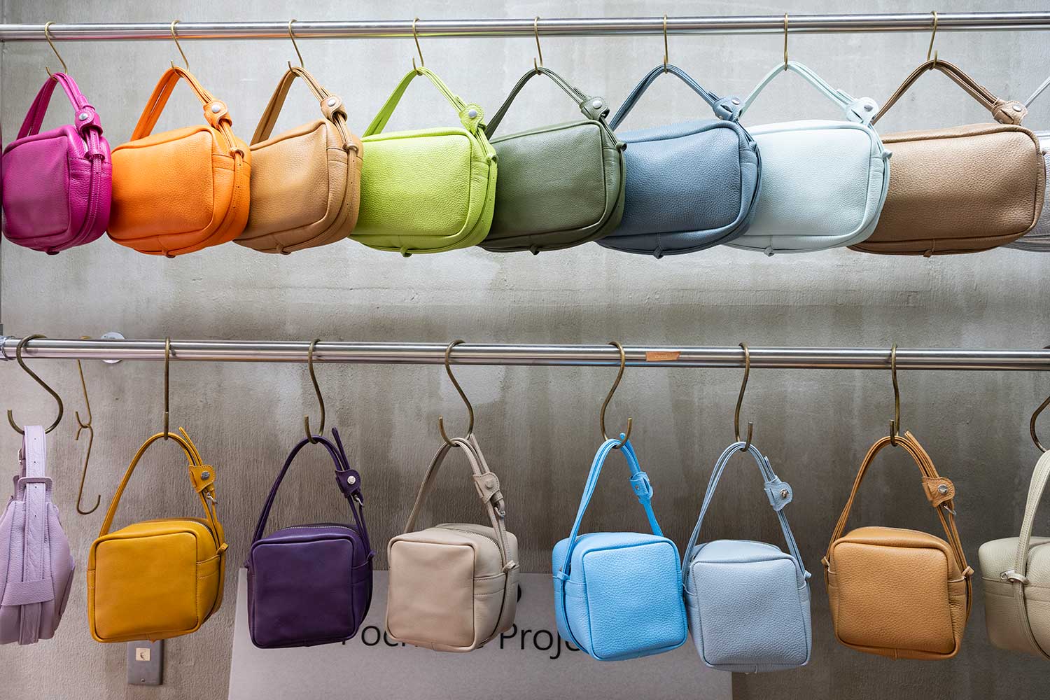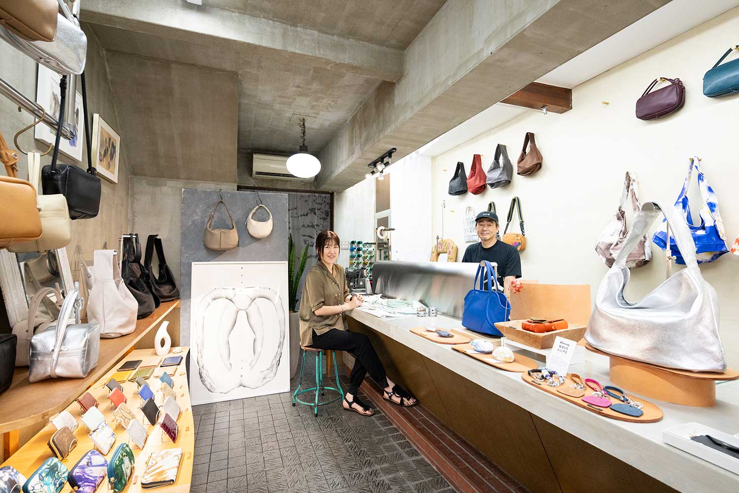 まさに“長”屋な七軒長屋に2024年オープンした『totokoko』は、元居酒屋のカウンターを生かし、お客さんがステンレス板で仕切りを作ってくれた。京島の芸術家・ヒロセガイさんが手掛けた内装は、カラフルで柔らかな革バッグや小物を引き立てるクールな印象。なのに、「おばさんが『ベルト穴をつけてくれ』と飛び込んで来たり『ワッペンをつけてほしい』とおじさんに頼まれたり。この街の人は距離が近くてチャーミングです」と、ほほ笑む工藤智未さん。